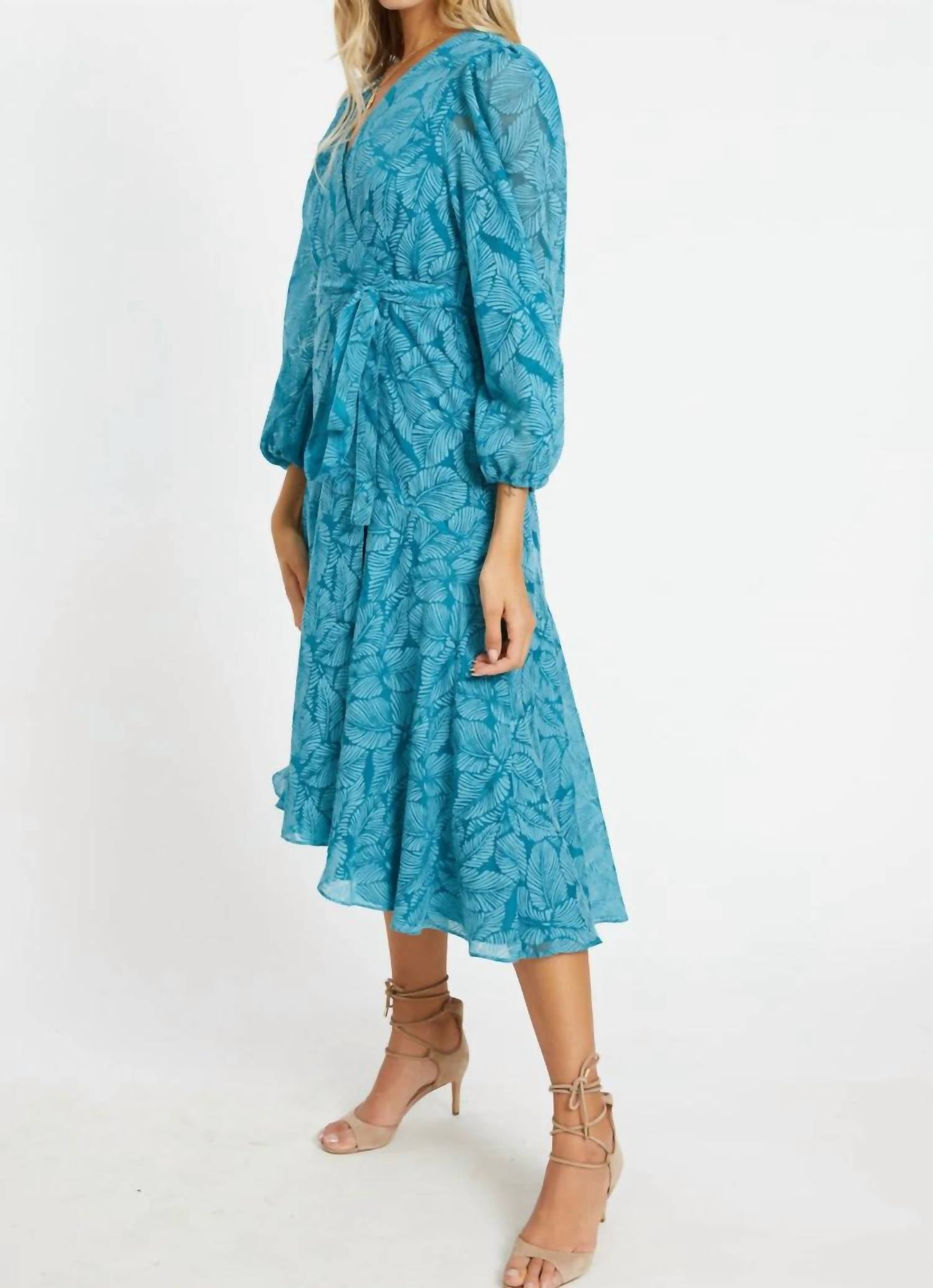 Style this maxi with your favorite statement necklace and sandals for the perfect look. The Moon Wrap Dress by CABALLERO in a striking Teal Leaf Burnout pattern is a captivating choice for any occasion. This elegant piece showcases long voluminous sleeves and a wrap-style bodice, designed with a self-tie at the waist for a flattering fit. Crafted from a soft 60% Cotton and 40% Polyester blend, it features an asymmetrical hem that enhances its midi-to-maxi length flow. Closure: Pull on. Care: Hand wash and line dry.