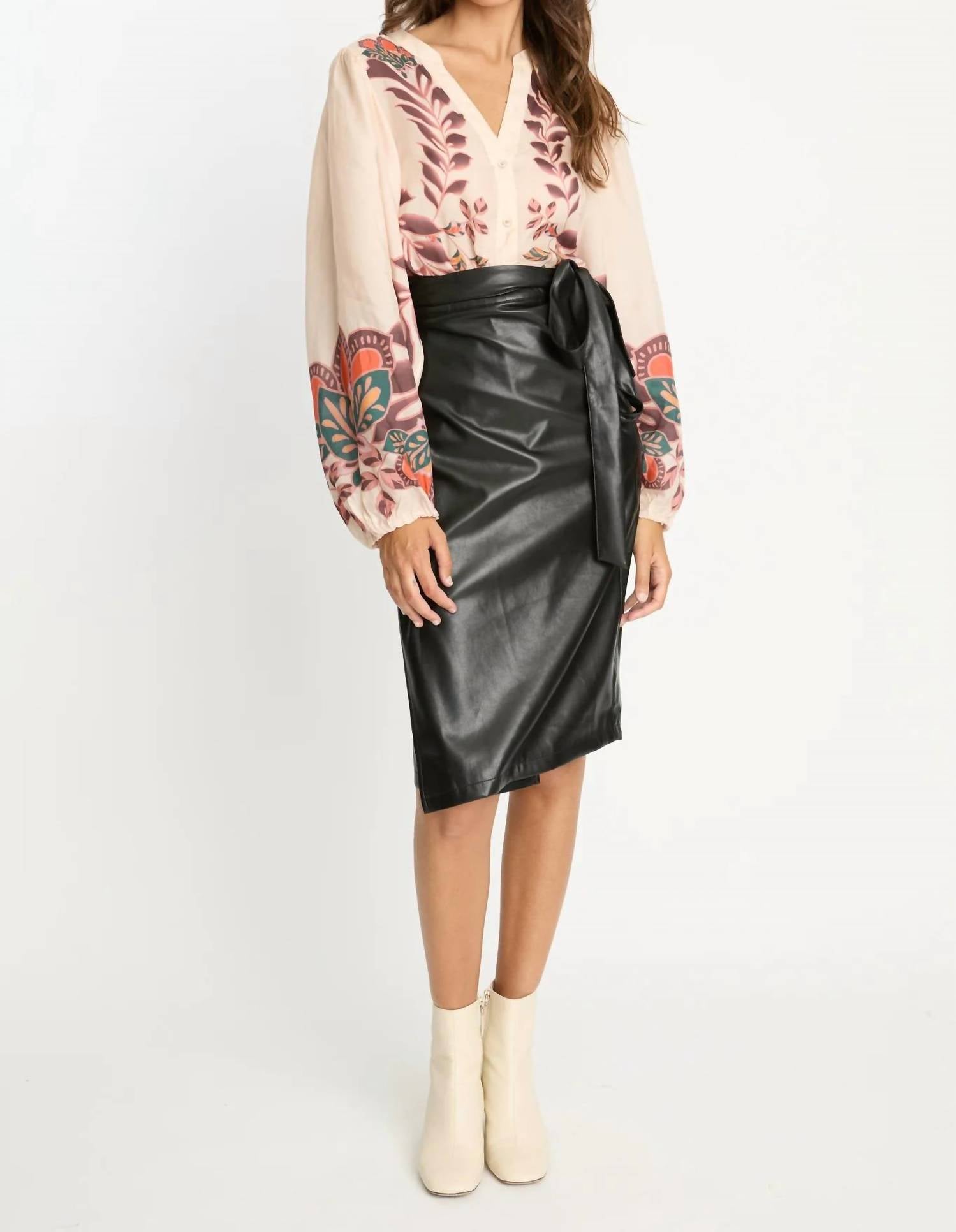 Presenting the CABALLERO Peyton Midi Skirt, a chic wardrobe addition in timeless black. This knee-length skirt is crafted from textured faux leather and features a modern, minimalist pencil silhouette. It comes with adjustable tie closures for a tailored fit, ensuring versatility and elegance in every wear. Perfect for any fall engagement, this skirt effortlessly merges polished and edgy styles.
