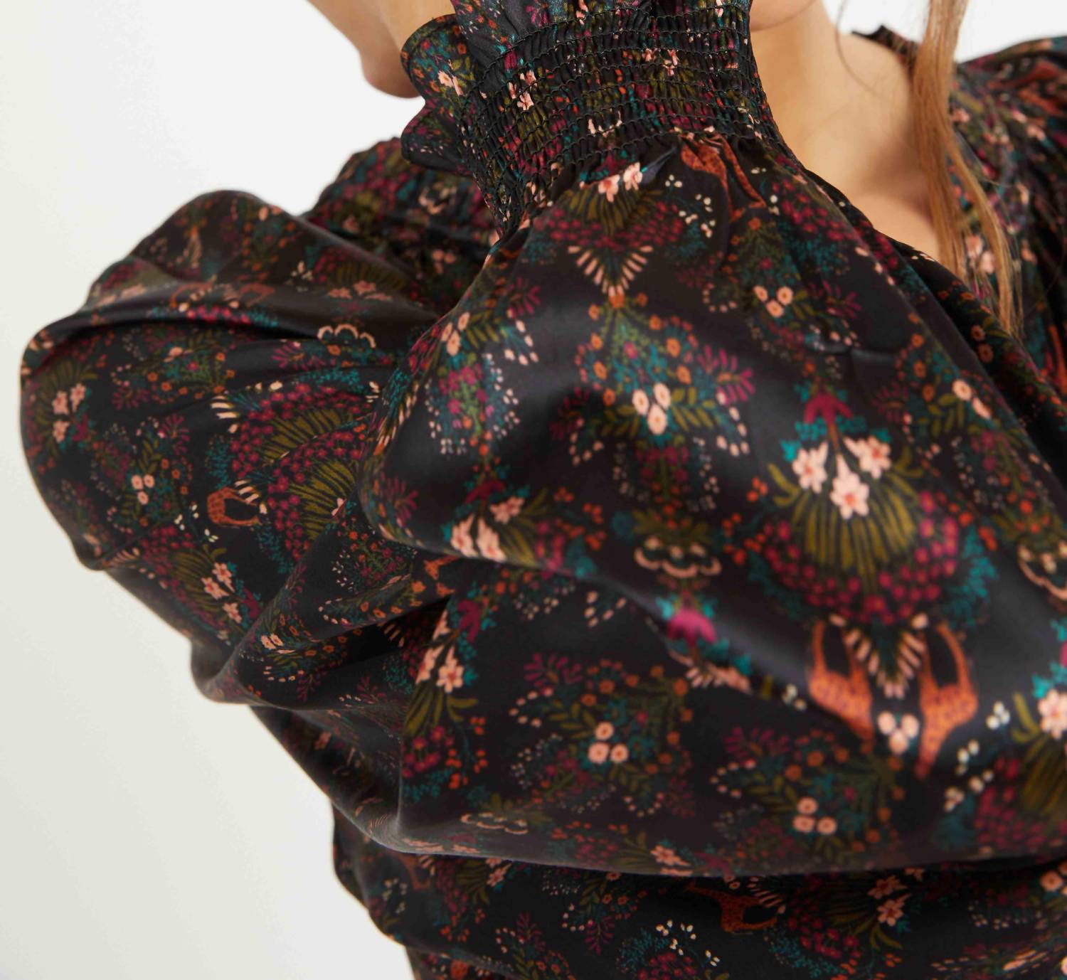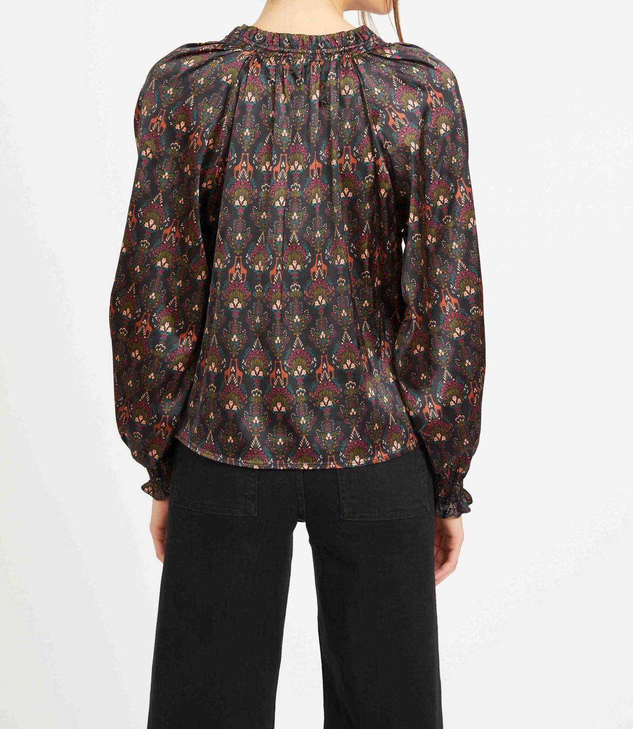 Elevate your wardrobe with the Vickie Top by CABALLERO, a statement piece in the enchanting Giraffe Bouquet print. This blouse features long sleeves with smocked cuffs and gathered shoulders, adding a touch of elegance to its relaxed fit. Crafted from a luxurious blend of 56% viscose, 41% rayon, and 3% spandex, this V-neck top is both comfortable and chic. Closure: Pull on. Care: Dry clean only.