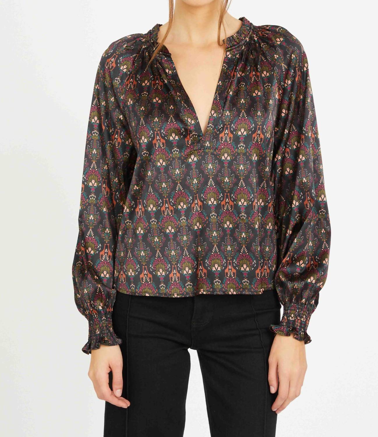 Pair this with your favorite jeans and slides for your next girls night out. Elevate your wardrobe with the Vickie Top by CABALLERO, a statement piece in the enchanting Giraffe Bouquet print. This blouse features long sleeves with smocked cuffs and gathered shoulders, adding a touch of elegance to its relaxed fit. Crafted from a luxurious blend of 56% viscose, 41% rayon, and 3% spandex, this V-neck top is both comfortable and chic. Closure: Pull on. Care: Dry clean only.