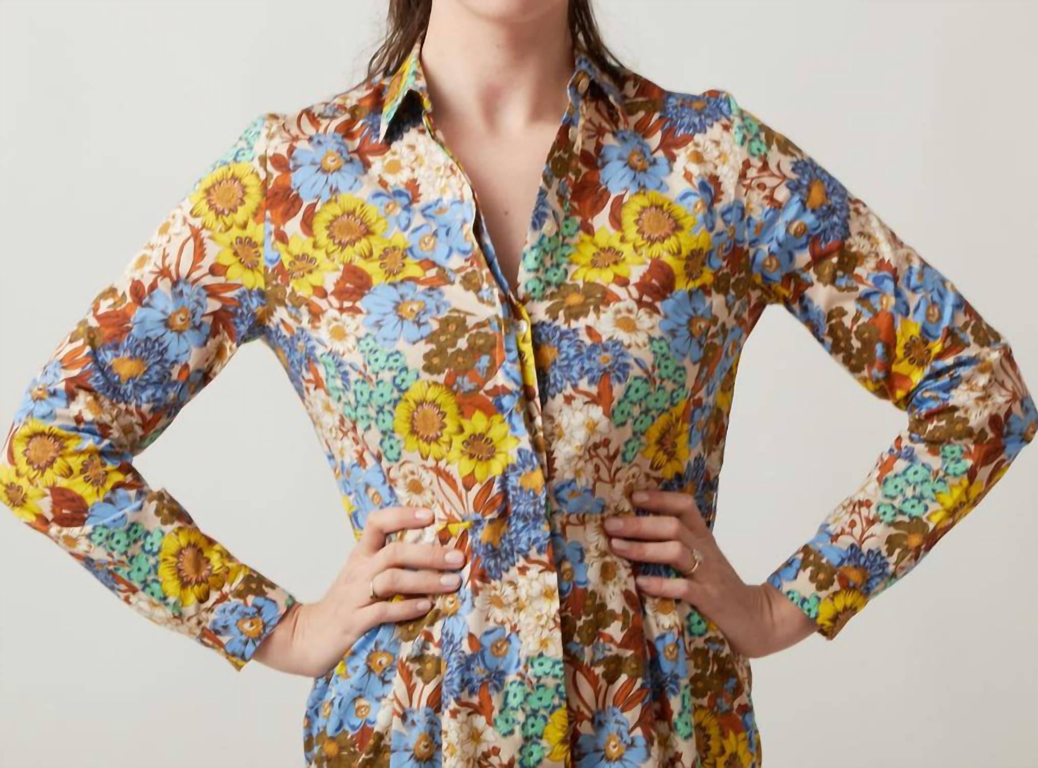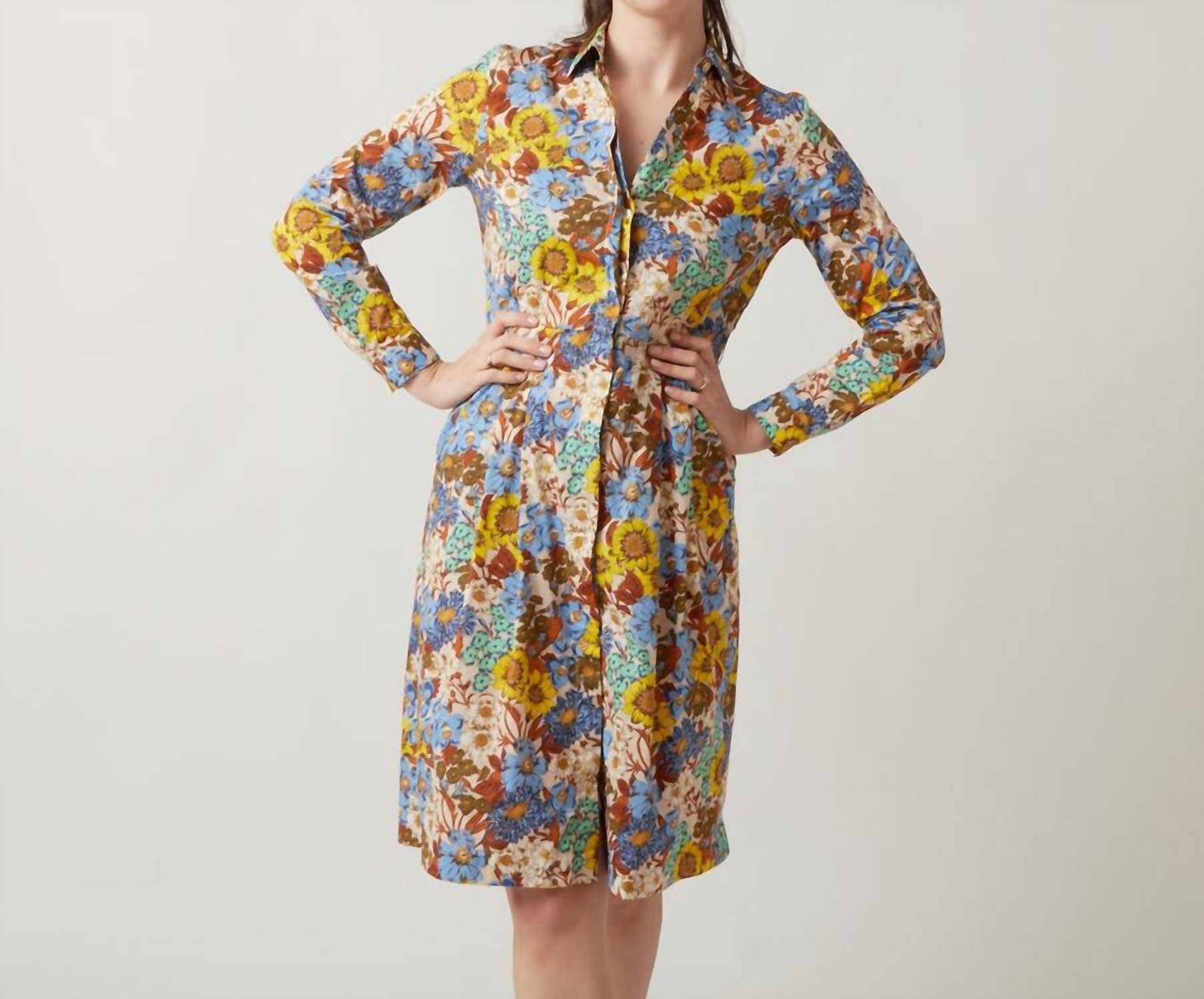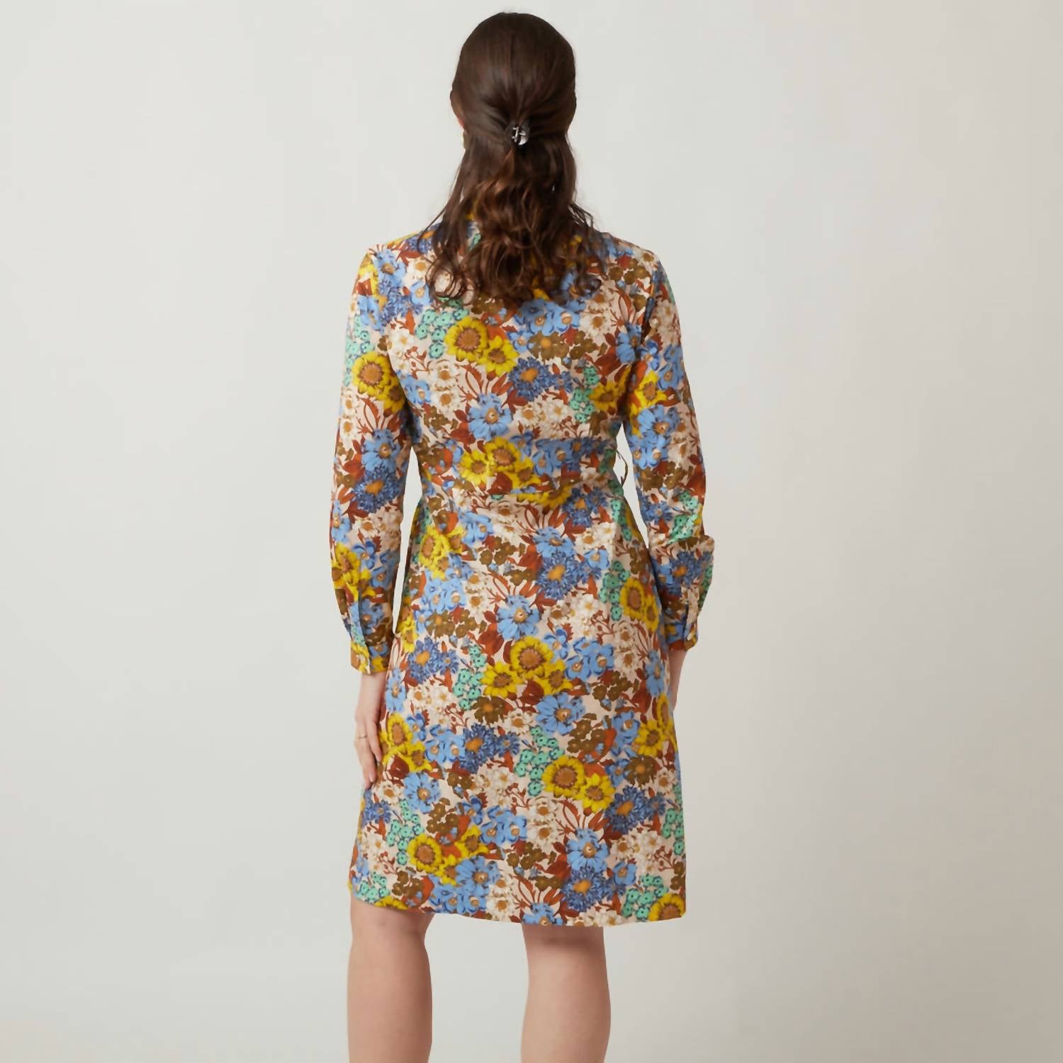 The Floral Shirt Dress by CALIBAN is a chic mini dress in a refreshing blue floral pattern, perfect for fall. Made from a cotton blend featuring 97% cotton and 3% elastane, it offers a comfortable and flattering fit. This women's dress includes long sleeves with a single button closure, a concealed button-down placket, and practical side slit pockets. It is finished with a matching fabric belt and a classic shirt collar, creating a timeless and versatile silhouette.