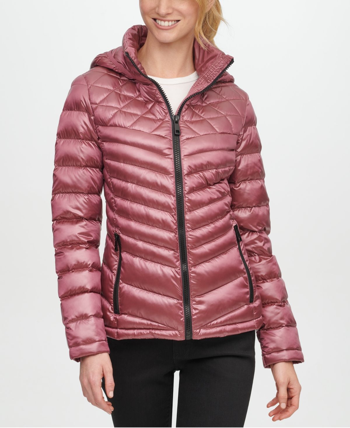 Casaco acolchoado com capuz Calvin Klein feminino, dobrável, brilhante, rosa, tamanho médio