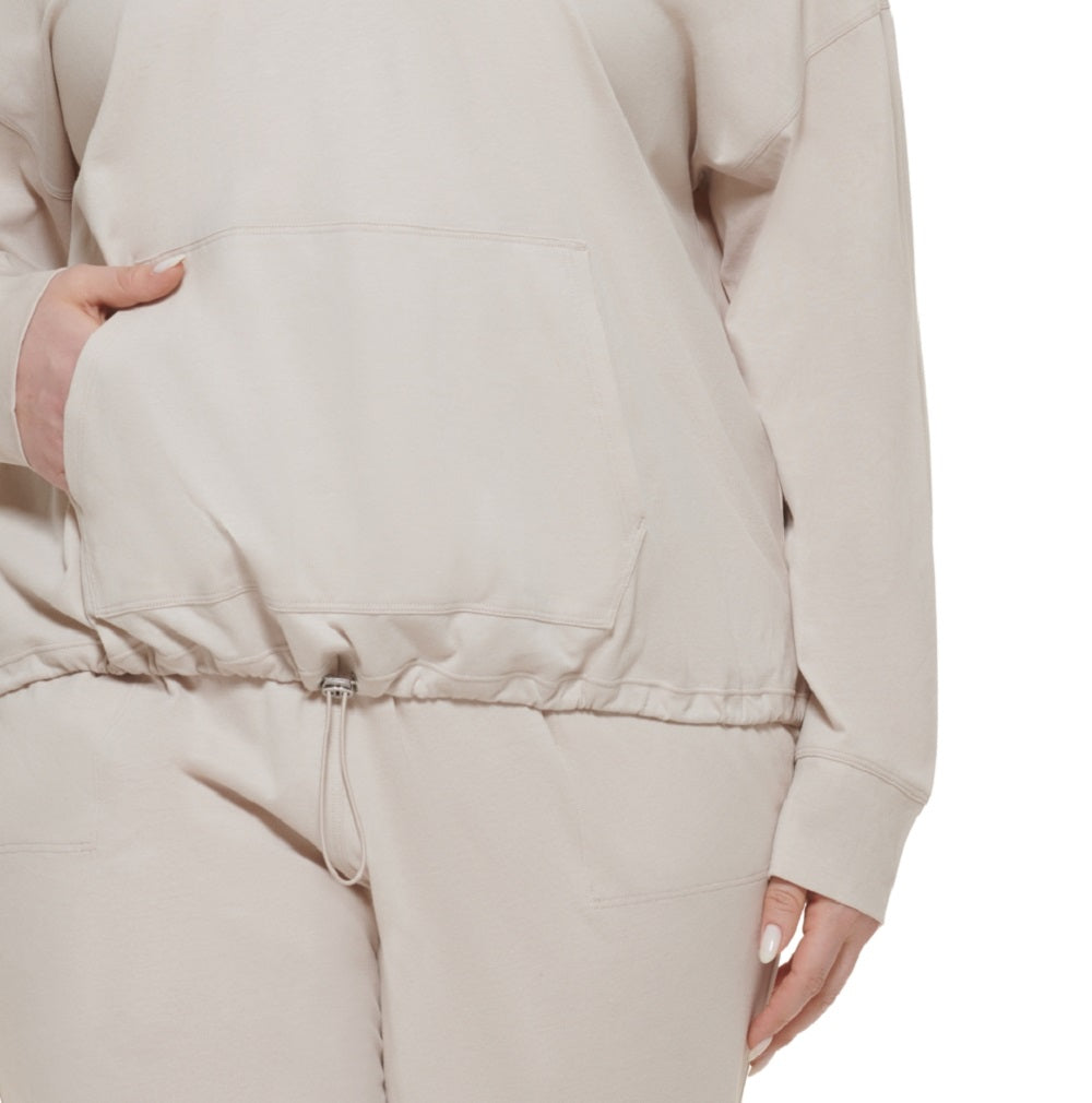 Vá para as ruas depois de ir à academia com este moletom com capuz essencial para exercícios da Calvin Klein; com cordão na bainha para um ajuste personalizável. | Aproximadamente 26-1/2 de comprimento; ombros caídos | Capuz anexado; bolso canguru na frente; cordão na bainha | Todo em algodão | Lavável à máquina | Importado