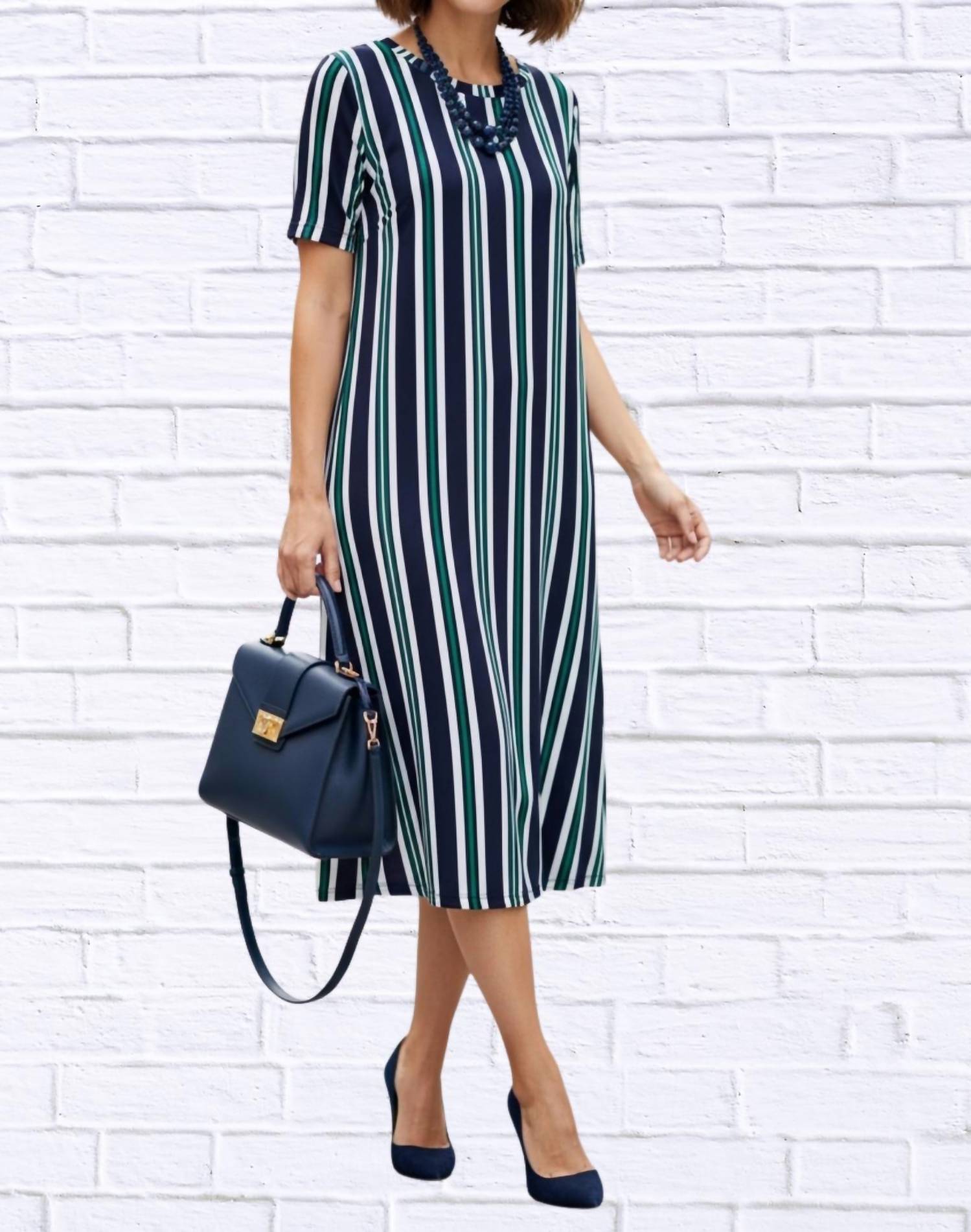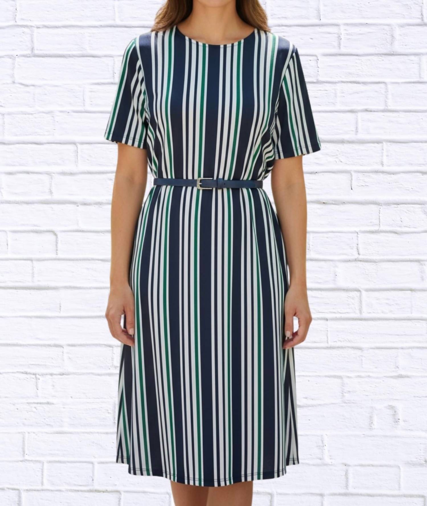 Just add slides or mules and you are good to go. Elevate your wardrobe with the Striped Knit Bon Bon Dress by Calypso, a perfect blend of elegance and comfort. This short sleeve midi dress is crafted from knit fabric, featuring a sophisticated stripe pattern that elongates the silhouette. The pull-on design ensures ease of wear, making it ideal for travel or any season, particularly spring. Enjoy effortless maintenance with its machine washable care, a true embodiment of quiet luxury for any dinner party occasion.