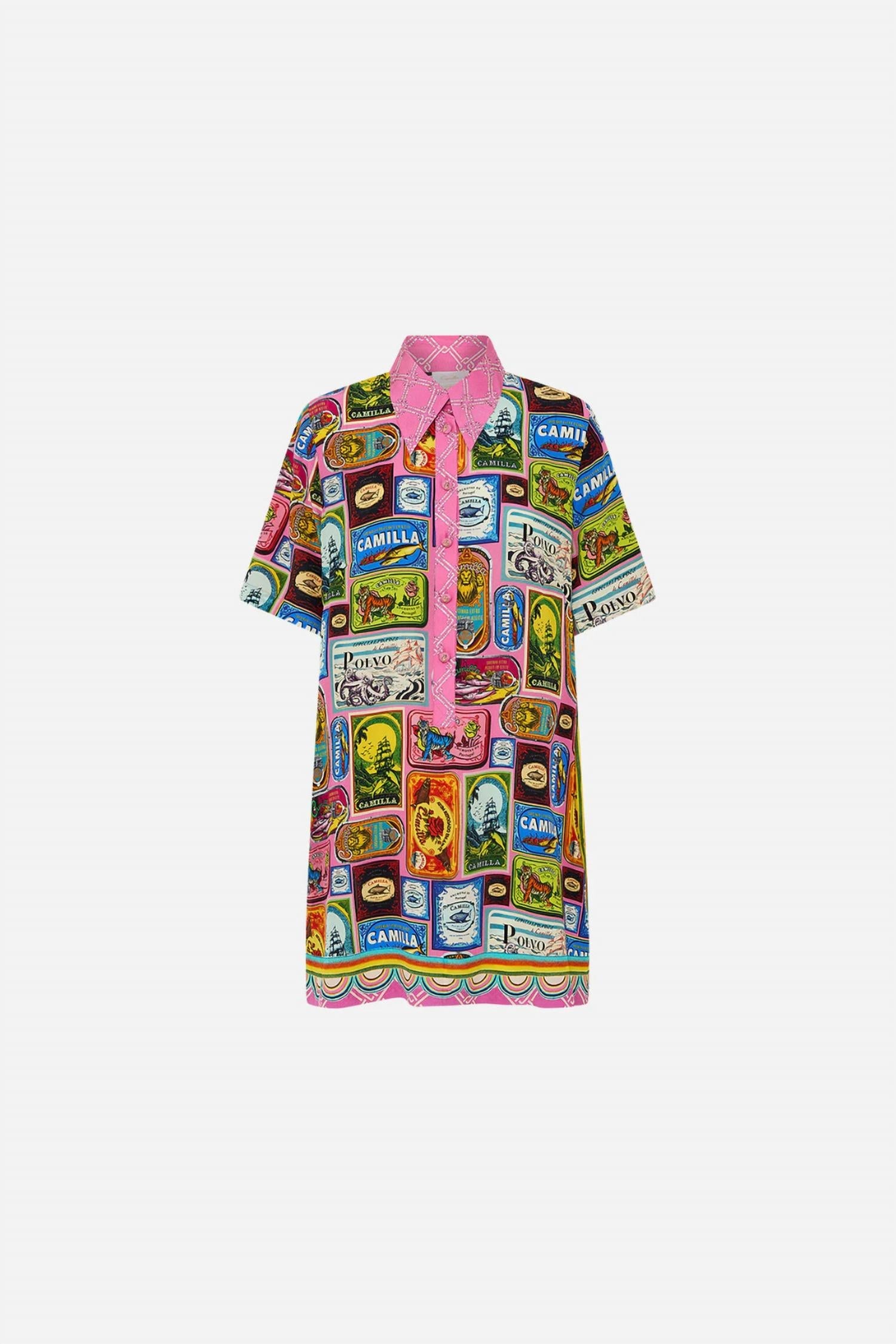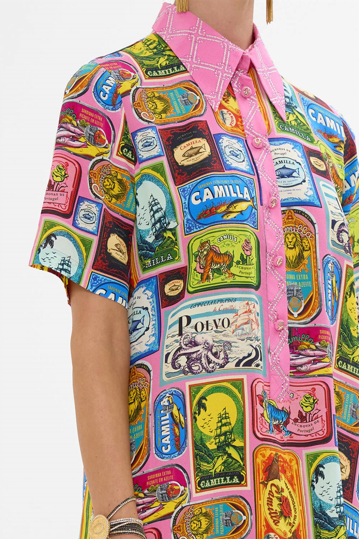 O tipo de vestido fácil e elegante que você vai usar durante toda a estação. Delicie-se com o charme vibrante do Vestido Camisa Mini de Manga Curta da Camilla, inspirado na Festa de Santo Antônio de Lisboa. Confeccionado em 100% seda, este vestido apresenta mangas curtas, um corte levemente relaxado e bainha curta com fecho de meia carcela com botões para um uso sem esforço. Desenhado na Austrália, ele reflete a energia vibrante do oceano, perfeito para qualquer ocasião de verão. Para cuidados, lave somente a seco.