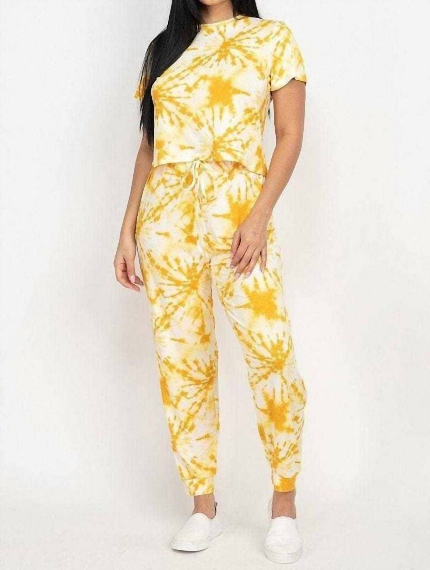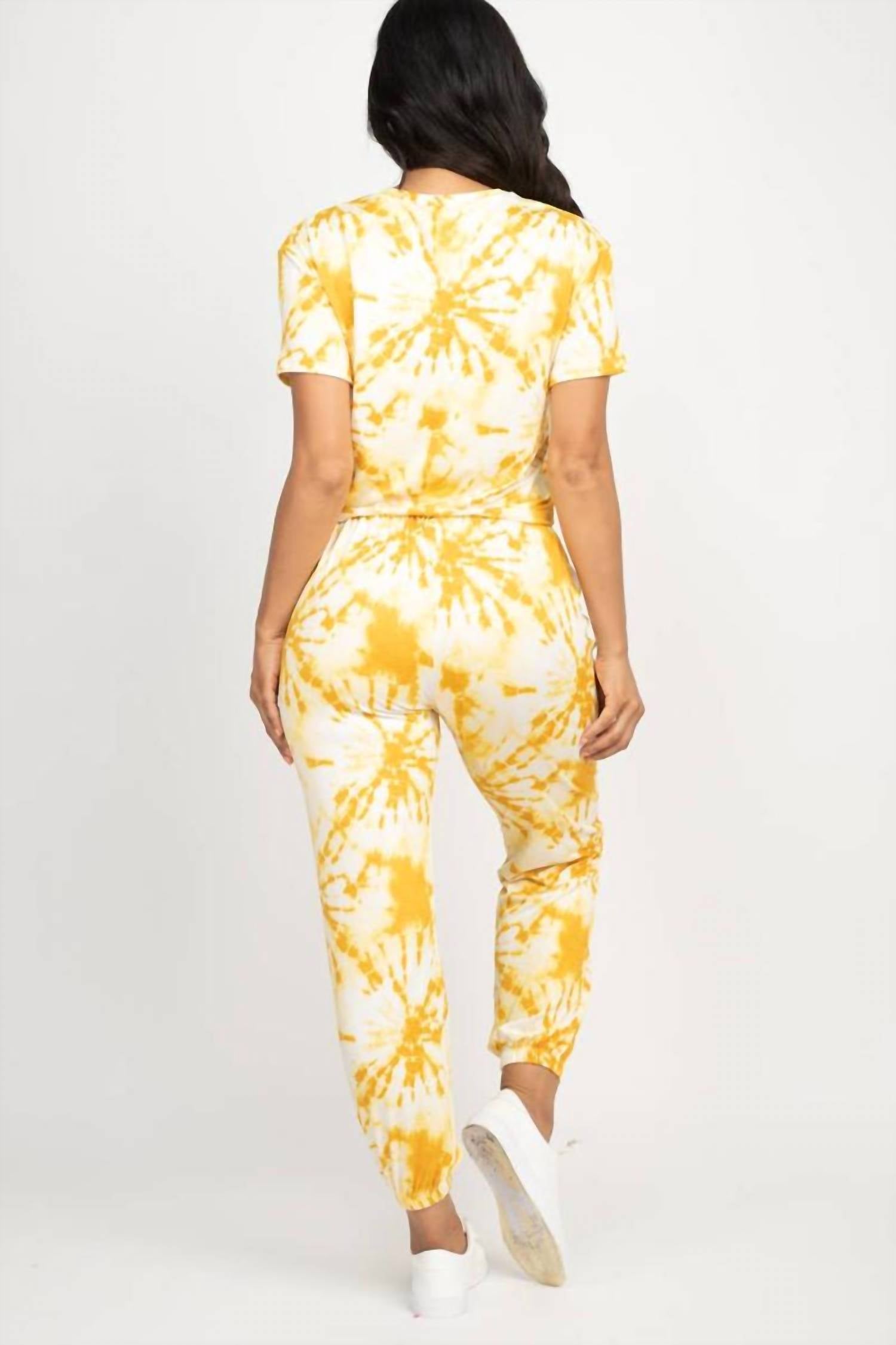Uma combinação perfeita. Este conjunto de duas peças é tão fofo que você vai desejar poder usá-lo fora de casa! Já mencionamos o quão confortável ele é? Você pode querer dois conjuntos! Eleve seu guarda-roupa de férias com o conjunto de top cropped tie-dye e calça jogger da Capella, um conjunto vibrante em amarelo-sol. Com mangas curtas e gola redonda, este conjunto é confeccionado em 100% poliéster para conforto e praticidade. Ideal para aventuras de verão, ele apresenta uma estampa tie-dye ousada que captura um senso de ousadia e determinação. A modelo tem 1,73 m e veste tamanho P.