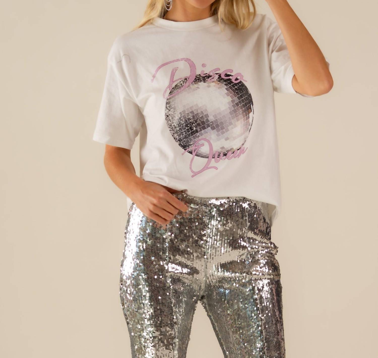 Apresentamos a camiseta de manga curta Marlie Disco Queens da Care Tucker, um item essencial no guarda-roupa feminino de streetwear. Confeccionada em 100% algodão orgânico premium, esta camiseta branca com estampa gráfica oferece um estilo quadrado e descontraído, com elasticidade mínima e peso médio para o máximo conforto. Desenhada com decote redondo e comprimento até o quadril, apresenta detalhes em ponto chicote nas mangas e na barra inferior, adicionando um toque de atitude. Fechamento: Puxe para vestir. Instruções de cuidado: Lavar à máquina. A modelo veste tamanho P (altura 1,75 m, busto 86 cm/B, cintura 63 cm).