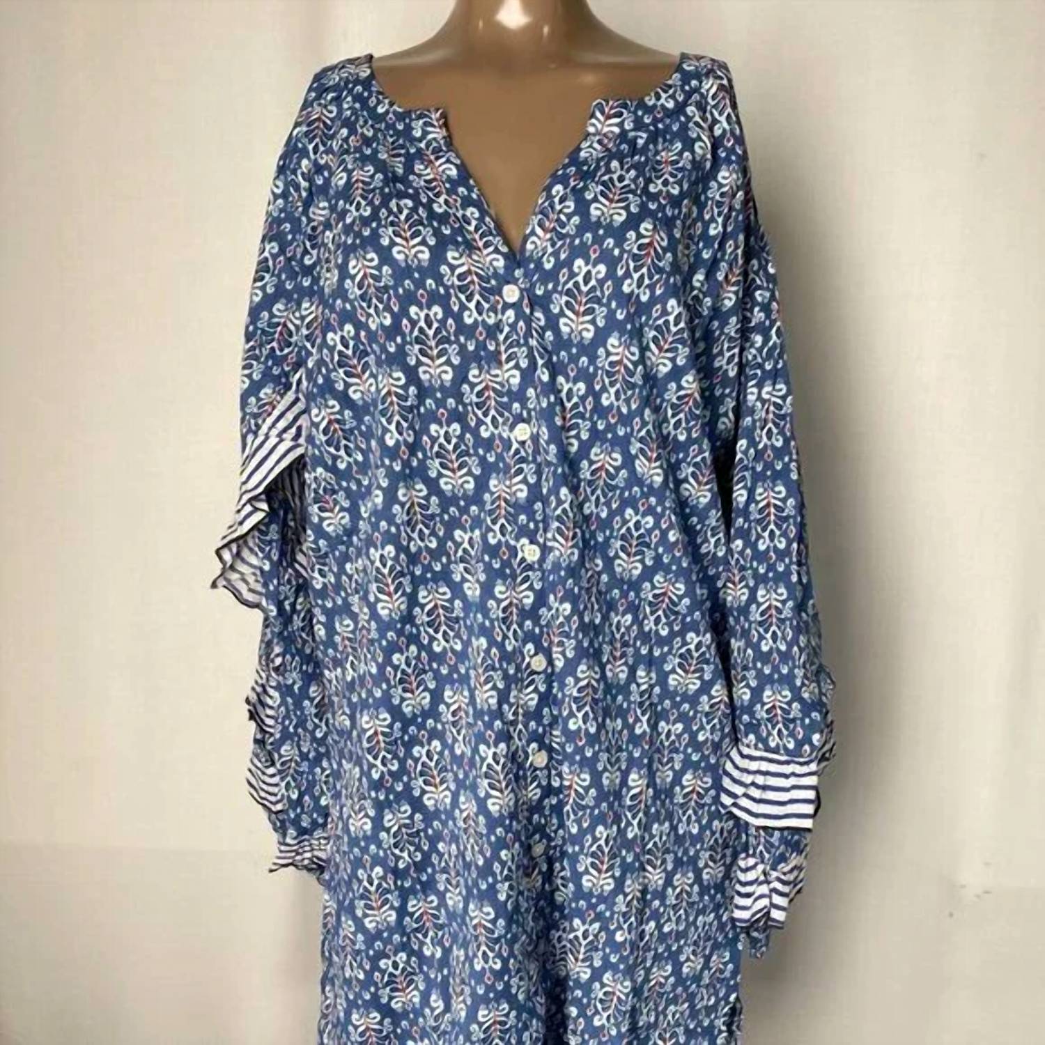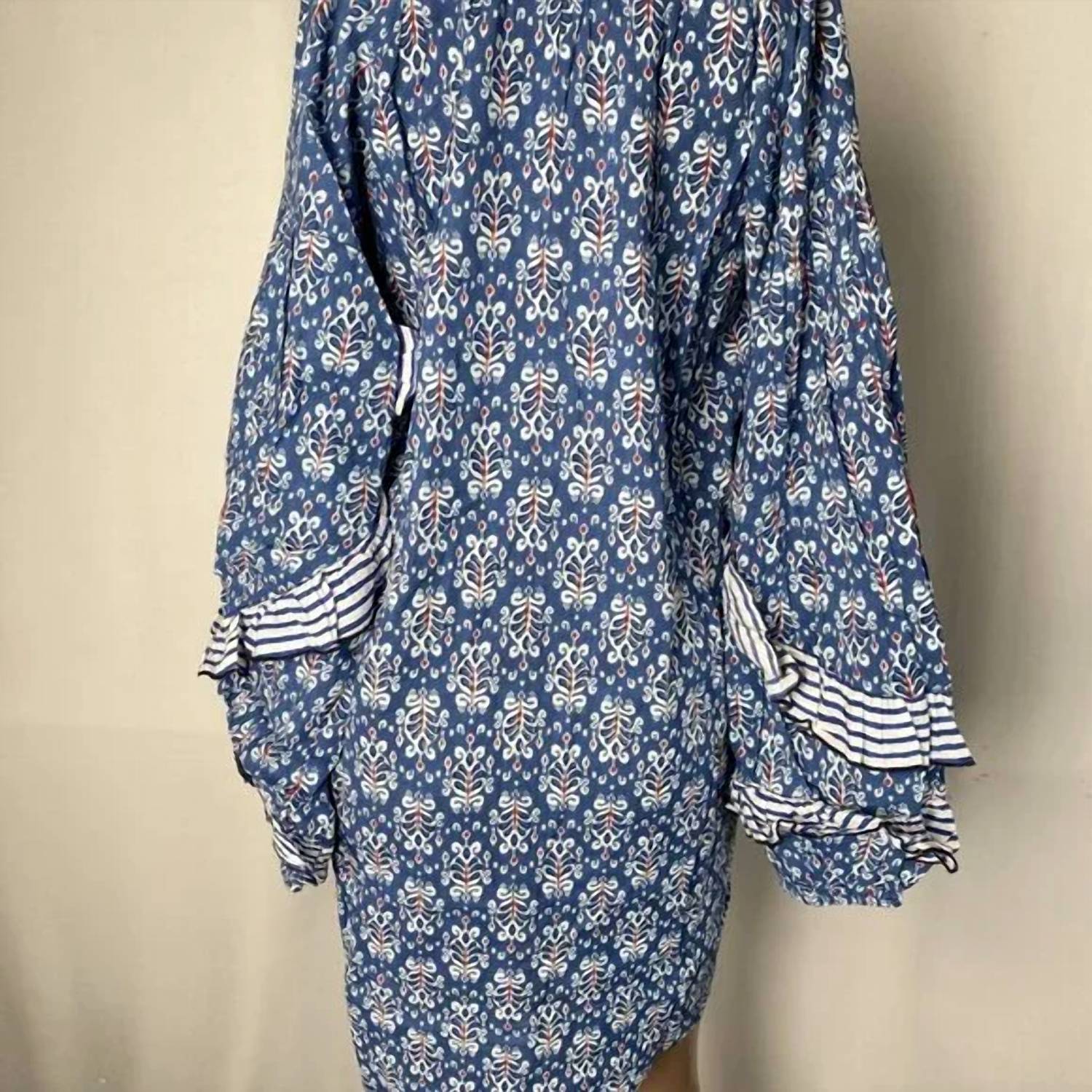 A short and breezy dress for those warmer days. Elevate your vacation wardrobe with the Women's Ellie Short Ruffle Floral Mini Cotton Tunic Dress by Chakeris. This dress features long sleeves, a shift tunic silhouette, and charming ruffle detailing in a vibrant blue floral pattern, perfect for summer outings. Crafted from 100% cotton, it offers comfort and breathable wear, with a button closure for ease. Originating from India, it’s best cared for by hand washing and line drying to preserve its quality.