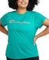 Um espectro de estilo esportivo brilha com o logotipo Champion nesta camiseta elegante plus size. | Aproximadamente 28 de comprimento na frente | Gola redonda | Logotipo Champion na frente e na fita traseira do pescoço | Logotipo C na manga esquerda | Algodão/poliéster | Lavável à máquina