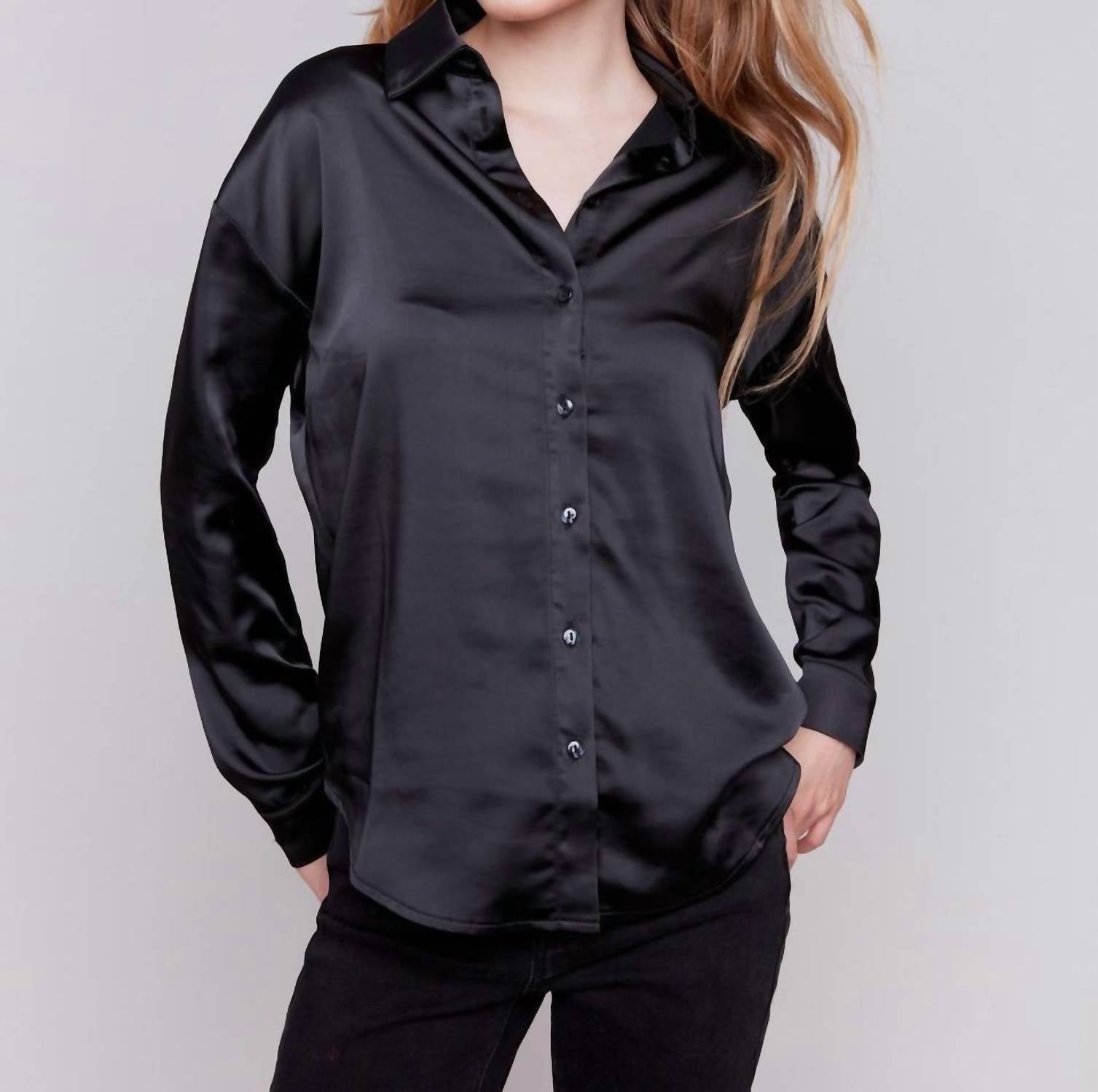 Uma blusa atemporal que nunca sai de moda. Apresentamos a Camisa de Botão em Cetim Sólido da CHARLIE B, uma adição sofisticada ao seu guarda-roupa. Esta blusa de manga comprida em um tom preto intenso oferece um design minimalista perfeito para eventos noturnos e também para uso profissional. Confeccionada em cetim para um toque luxuoso, possui gola clássica e fecho prático de botões. Cuidados: Lavar à mão e secar na horizontal.
