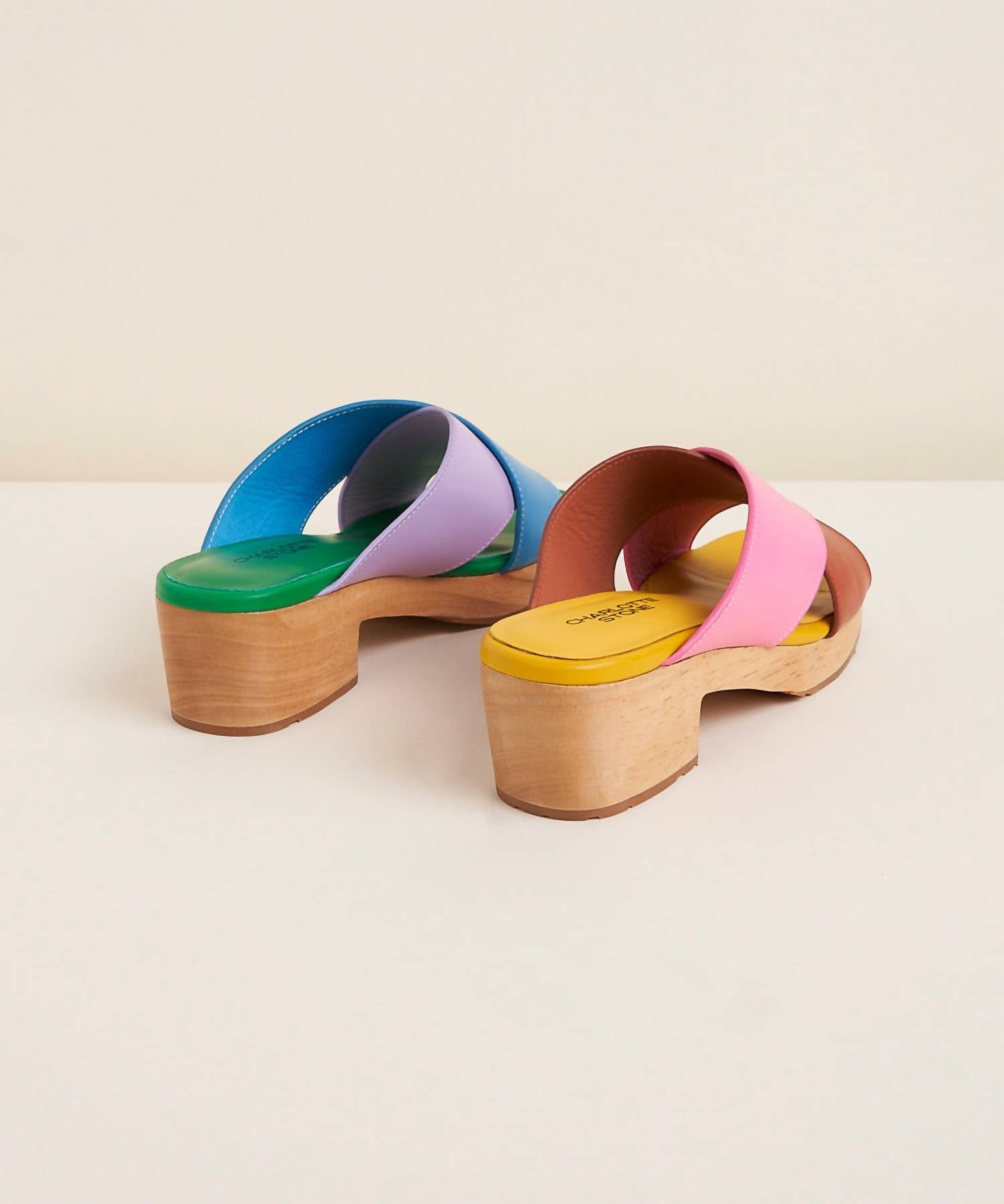 Experience bold style with the Women's Amos Clog Sandal by Charlotte Stone, featuring vibrant multicolor leather uppers. These sandals offer a comfortable 2.5" block heel with a 1" platform, perfect for the maximalist trend. Designed with a round toe for vacation wear, these sandals ensure both style and comfort with their memory foam insole. Please note: Our shoes run true to size and are available in a standard B width; sizing up is recommended for half sizes or wider feet.