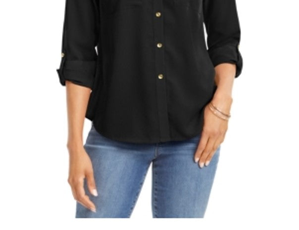Camisa feminina Charter Club com botões frontais, preta, tamanho pequeno