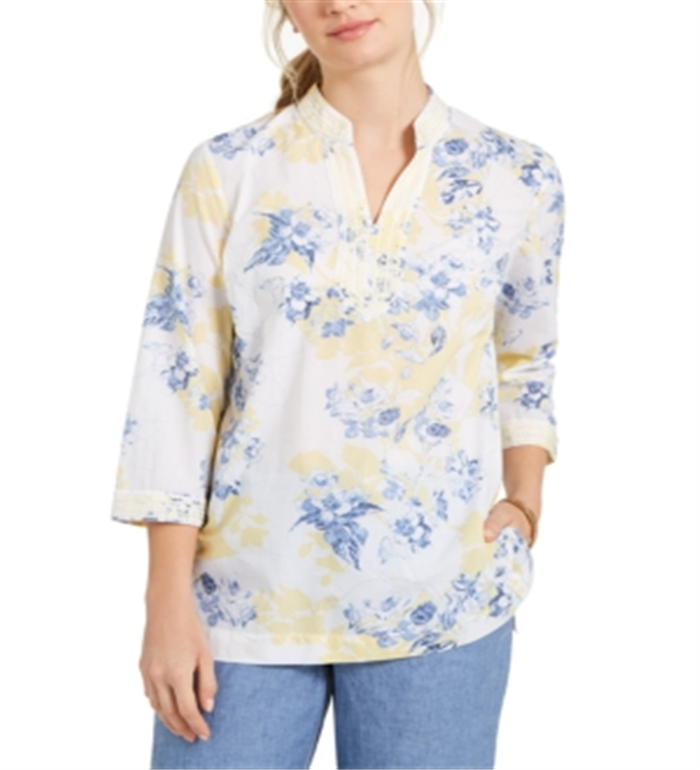 Túnica feminina Charter Club de algodão com bordado e estampa de voile, tamanho pequeno, amarela