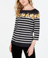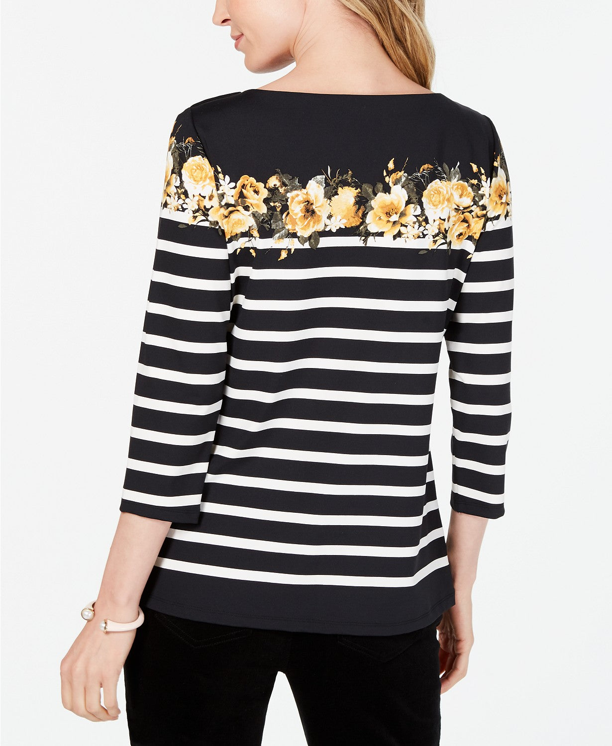 Charter Club Top feminino listrado com estampa floral, tamanho médio, preto