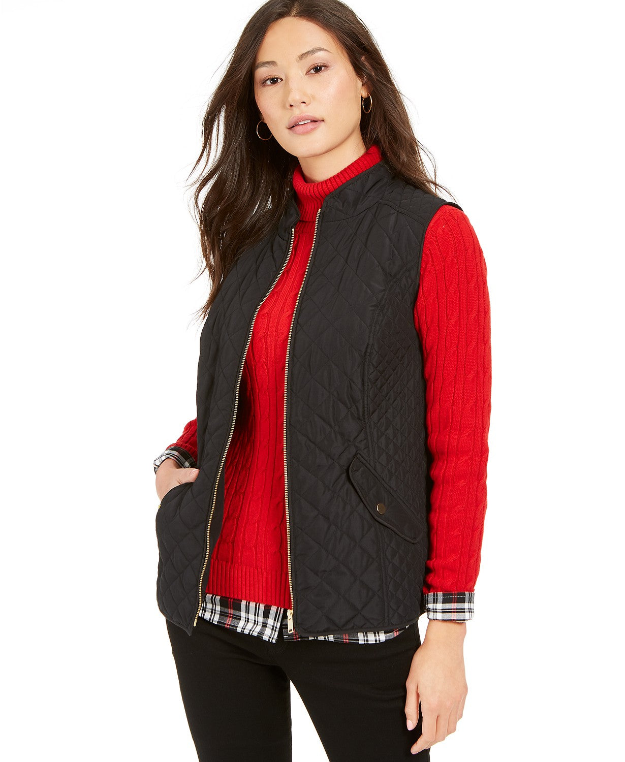Colete feminino Charter Club Petite com zíper frontal em algodão acolchoado, preto, tamanho pequeno pequeno