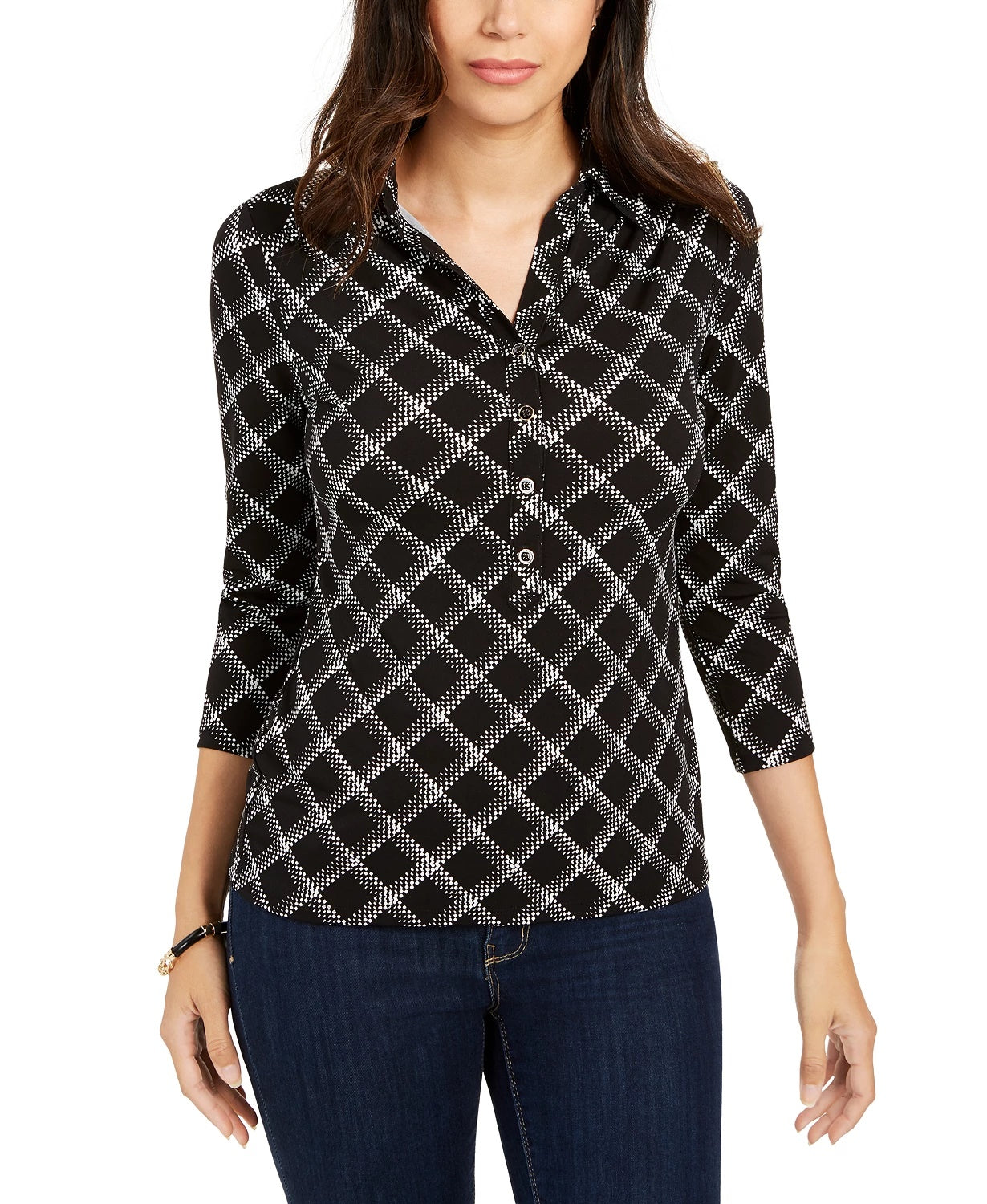 Camisa polo xadrez feminina Charter Club, preta, tamanho médio