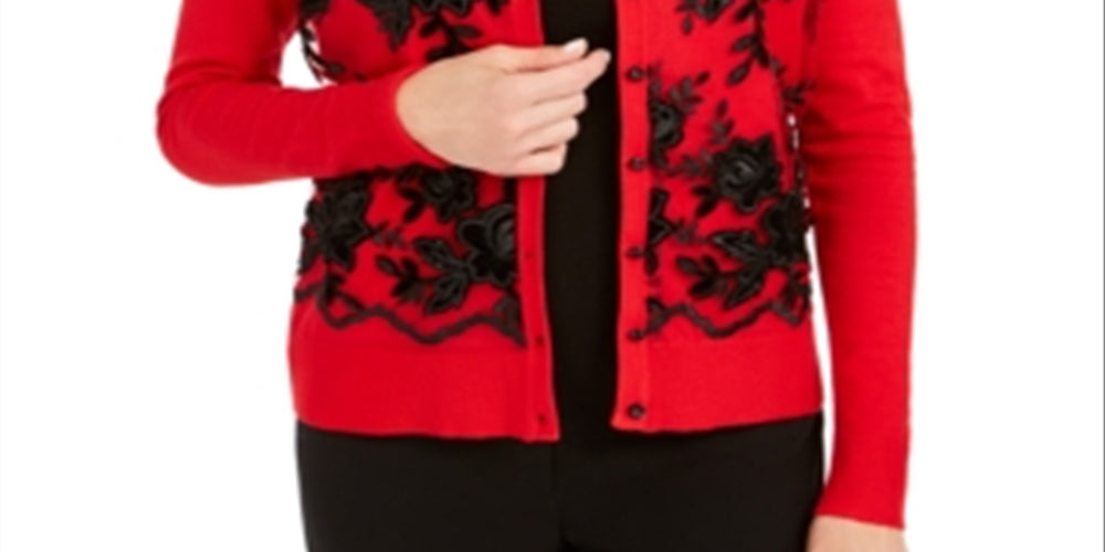 A peça perfeita para apimentar sua coleção | este suéter de botões da Charter Club é polido com uma mistura chique de apliques de veludo | bordados e lantejoulas. | Ajustado; aprox. 23-1/2 de comprimento | Devido ao tamanho generoso | sugerimos um tamanho menor para um ajuste perfeito