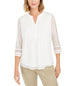 Fluído com toques femininos | este top de mangas transparentes da Charter Club apresenta lindos franzidos e detalhes bordados em renda. | Ajuste fácil; aprox. 25-1/2 de comprimento | Projetado para se ajustar e valorizar pessoas de 1,62 m ou menos | Decote aberto | Detalhe franzido no peito | Mangas transparentes com bordado em renda