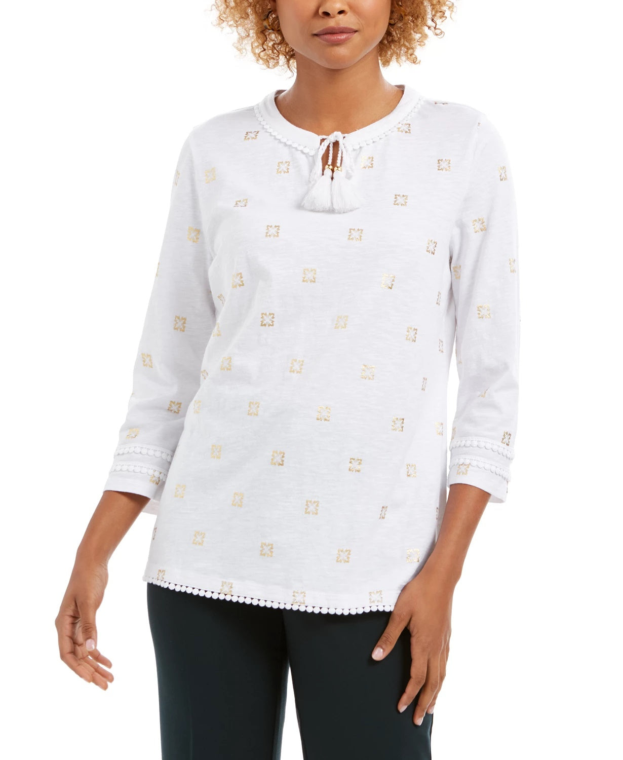 Top feminino Charter Club com decote em borla e manga 3/4, branco, tamanho extragrande