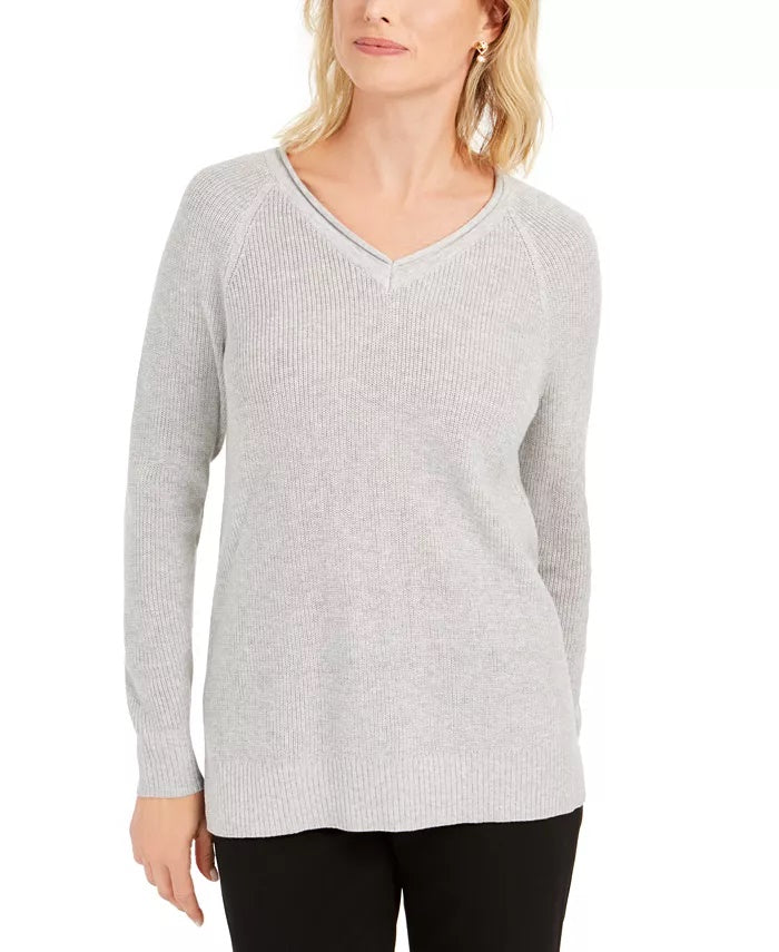 Suéter de malha feminino com decote em V Charter Club, cinza, tamanho grande