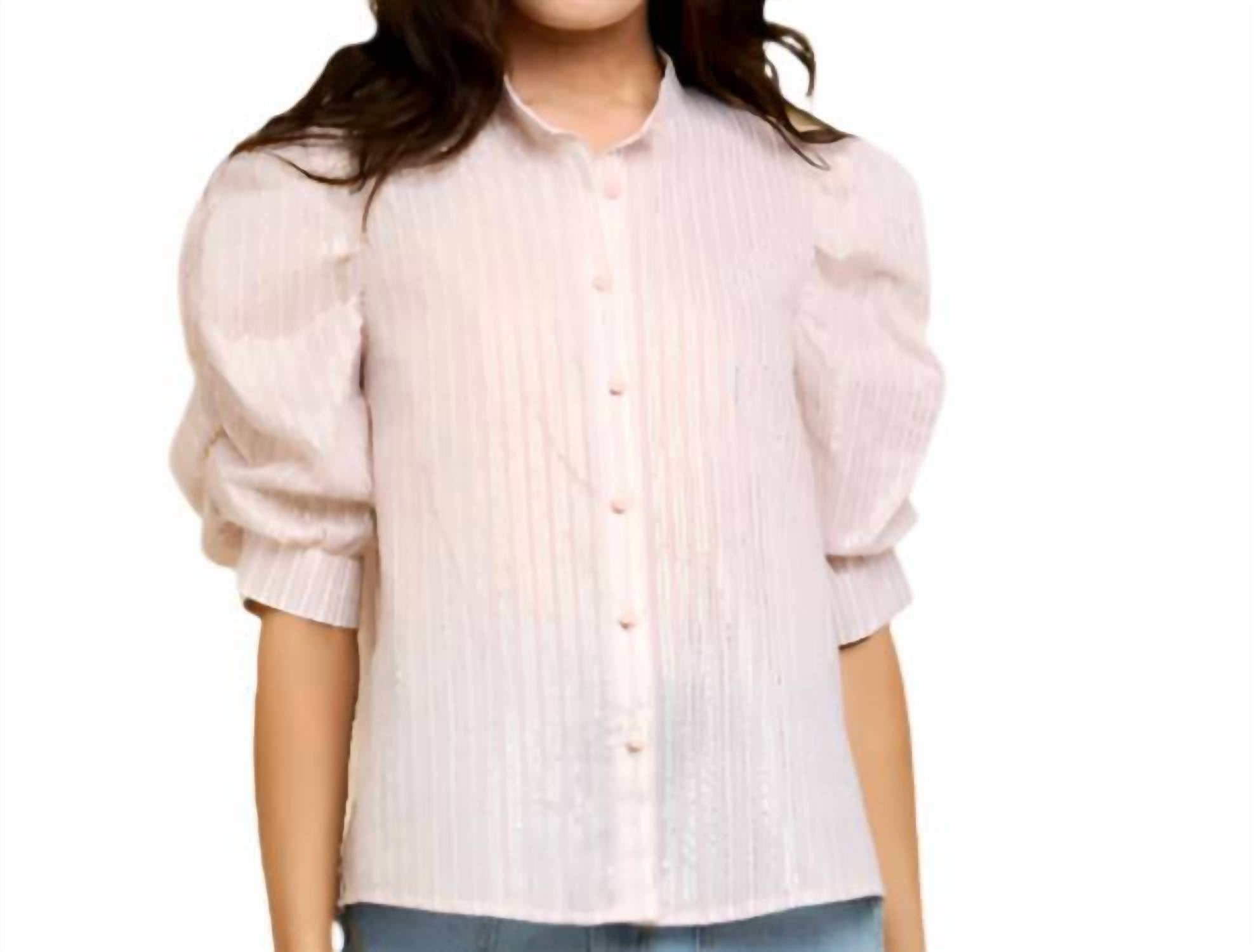 Perfectly tailored and soft to the touch. Introducing the Puff Sleeve Button Down Top by CIEBON, a stylish addition to your wardrobe in an elegant blush stripe pattern. With elbow sleeves and a classic collar neckline, this top offers a sophisticated look for any occasion. Closure: Button closure. Perfect for women seeking a chic, everyday option with a flair of elegance.