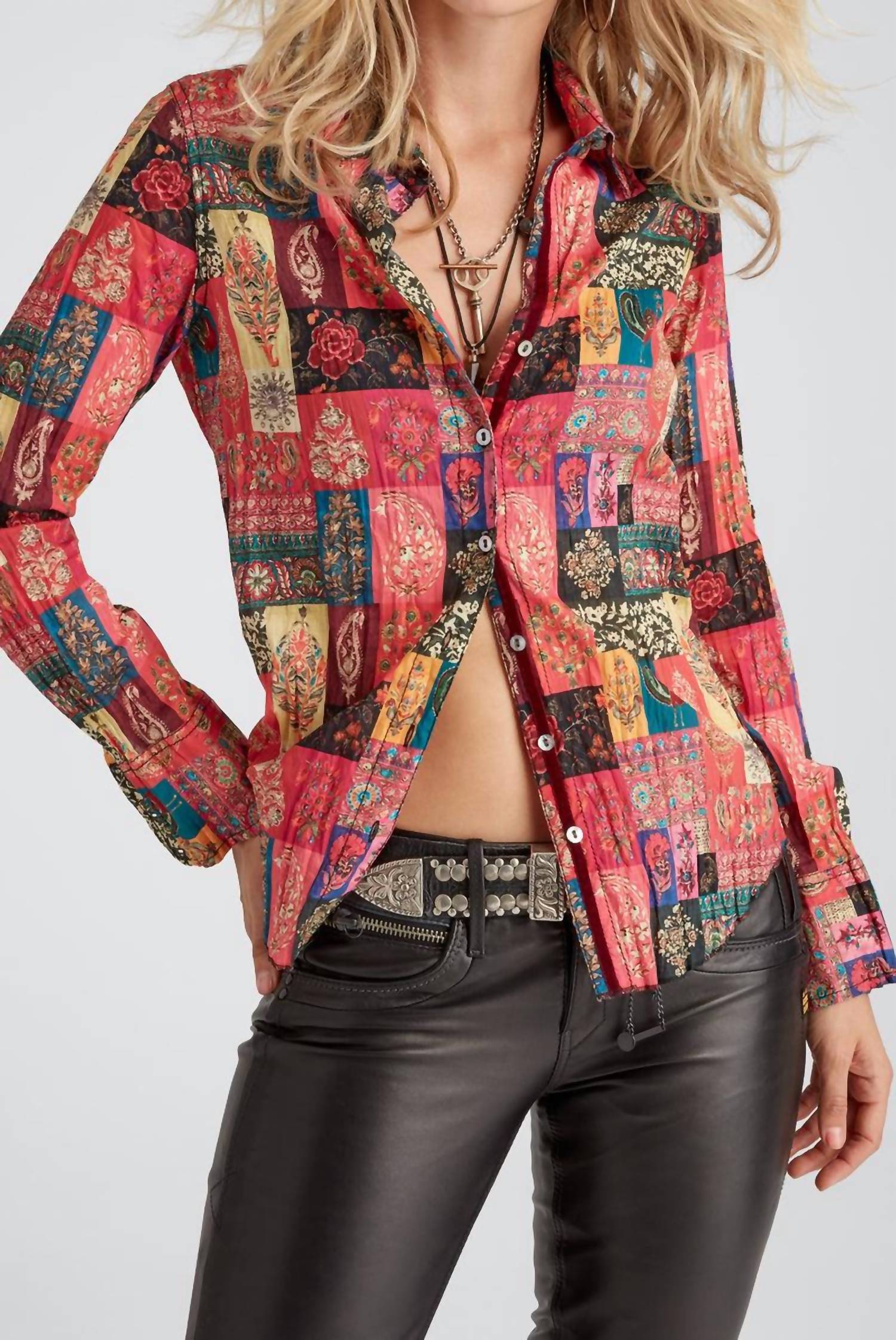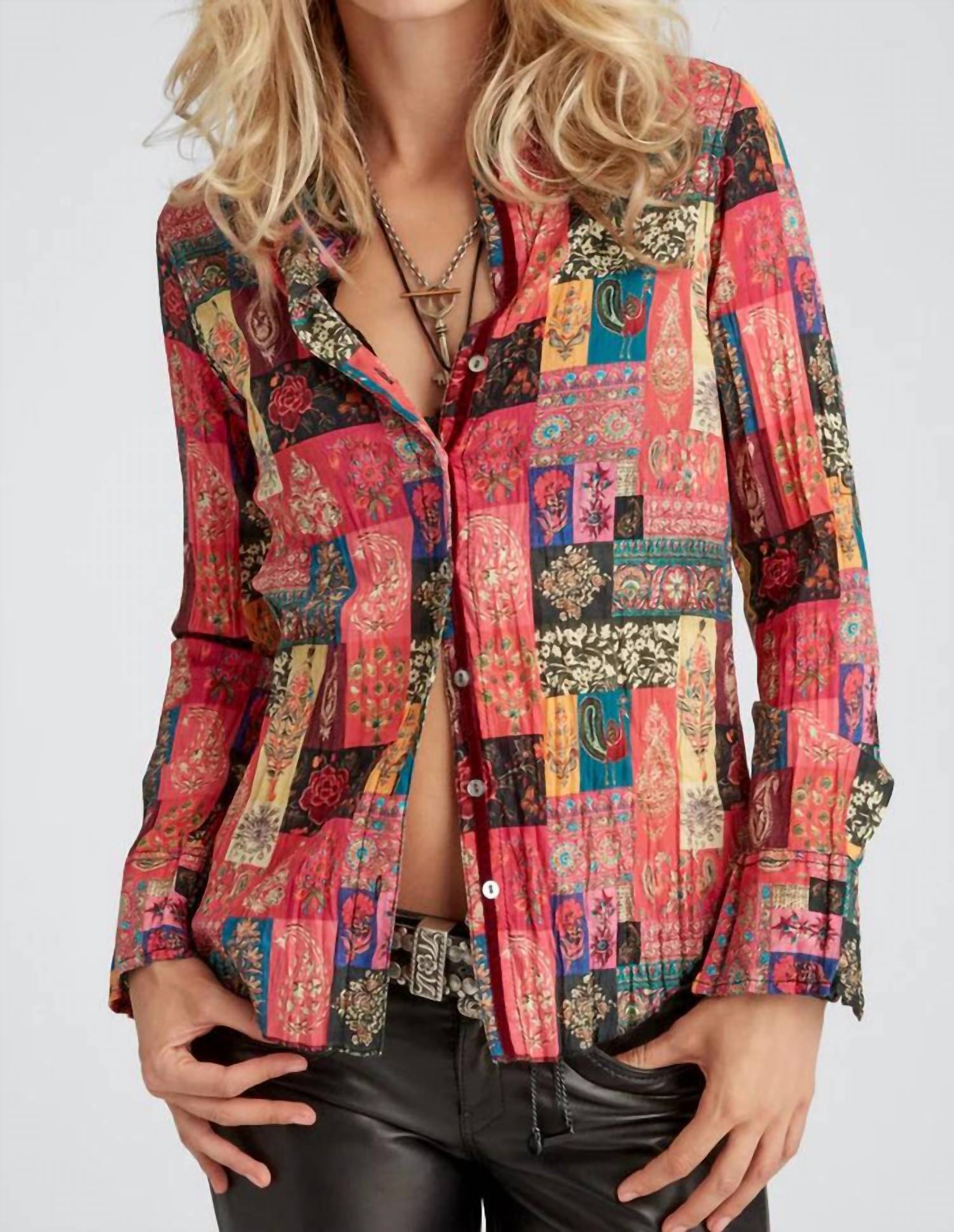 This button down shirt is comfortable yet polished. Elevate your wardrobe with the Crinkle Blouse by Cino in a striking Sultan print. Crafted from 100% cotton crinkle voile, this long sleeve shirt features a stylish button closure and is perfect for concert occasions or any festive Thanksgiving gathering. The roll-up sleeve design with a ribbon detail adds a playful touch to this patterned piece. Care for this garment by machine washing and line drying to maintain its vibrant look.