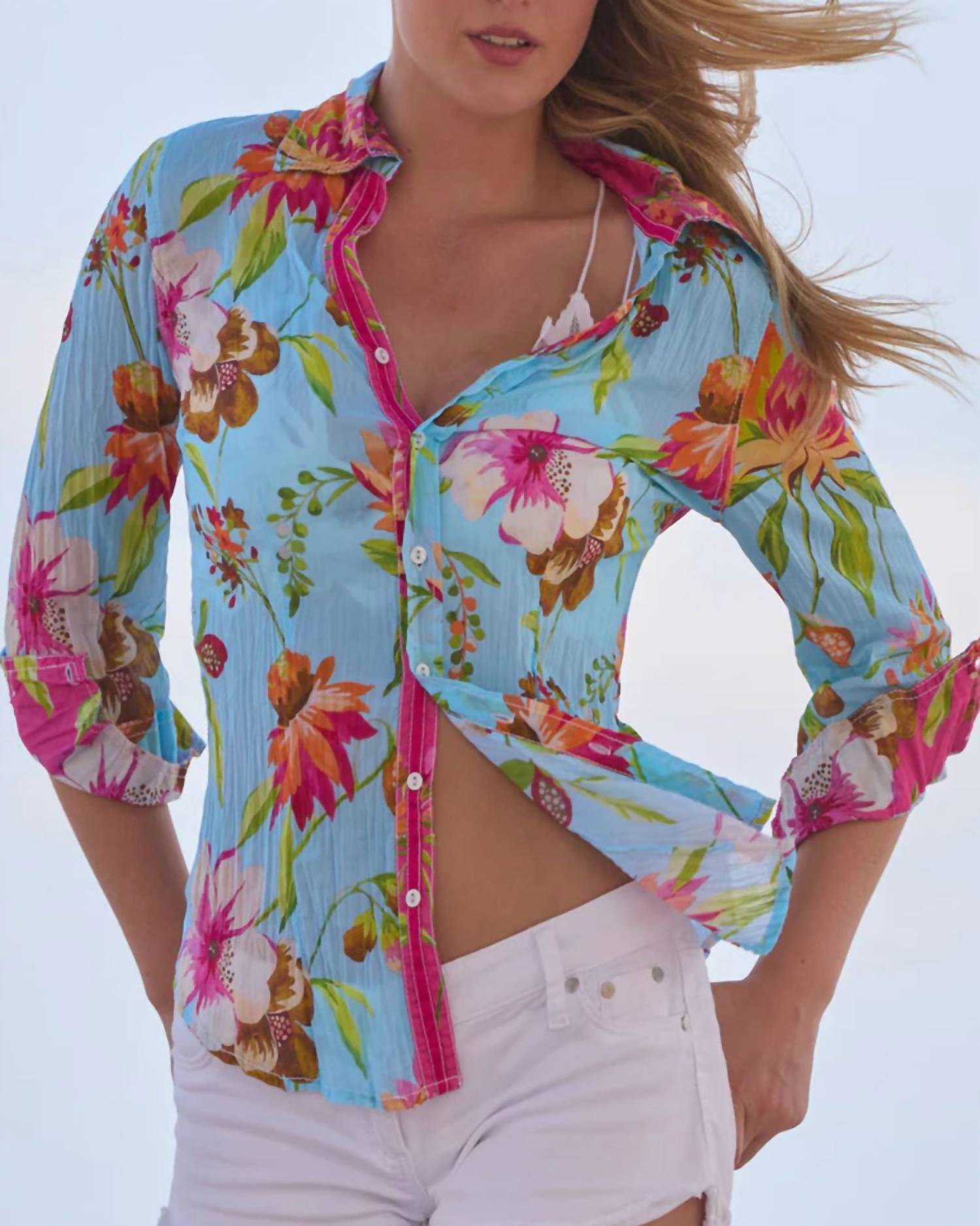 Eleve seu guarda-roupa de férias com a Camisa Tropicana Crinkle Button Down da Cino, confeccionada em 100% algodão para um caimento relaxado. Esta camisa azul-claro apresenta uma estampa floral em voil amassado, complementada por mangas três quartos enroladas com detalhe de fita para um toque boho chique. O fecho de botão e a gola alta realçam seu visual clássico, tornando-a perfeita para escapadas de primavera. Instruções de cuidado incluem lavagem à máquina.