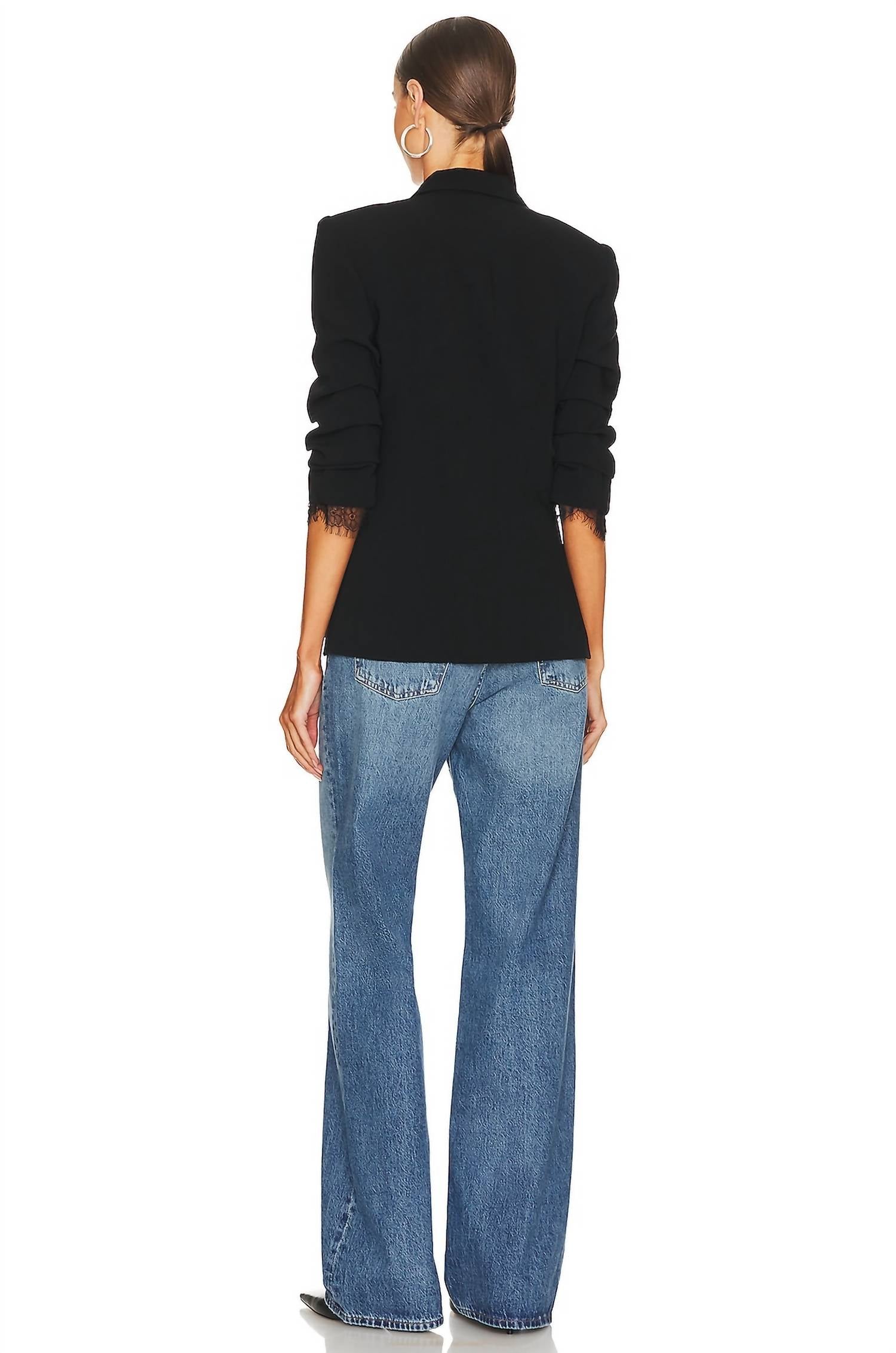A blazer so versatile you can wear it to the office or pair it with jeans for a more casual look. Elevate your workwear wardrobe with the Cinq a Sept Keeves Blazer, a sophisticated staple in classic black. This long-sleeve blazer is crafted with a shell of 69% triacetate and 31% polyester, featuring contrast acrylic fabric and a partial polyester-elastane lining for added comfort. Made in China, it boasts a single-button front closure, padded shoulders, and gathered sleeves. Care for this elegant piece with a simple dry clean, preserving its crepe fabric with lace trim and faux flap pockets.