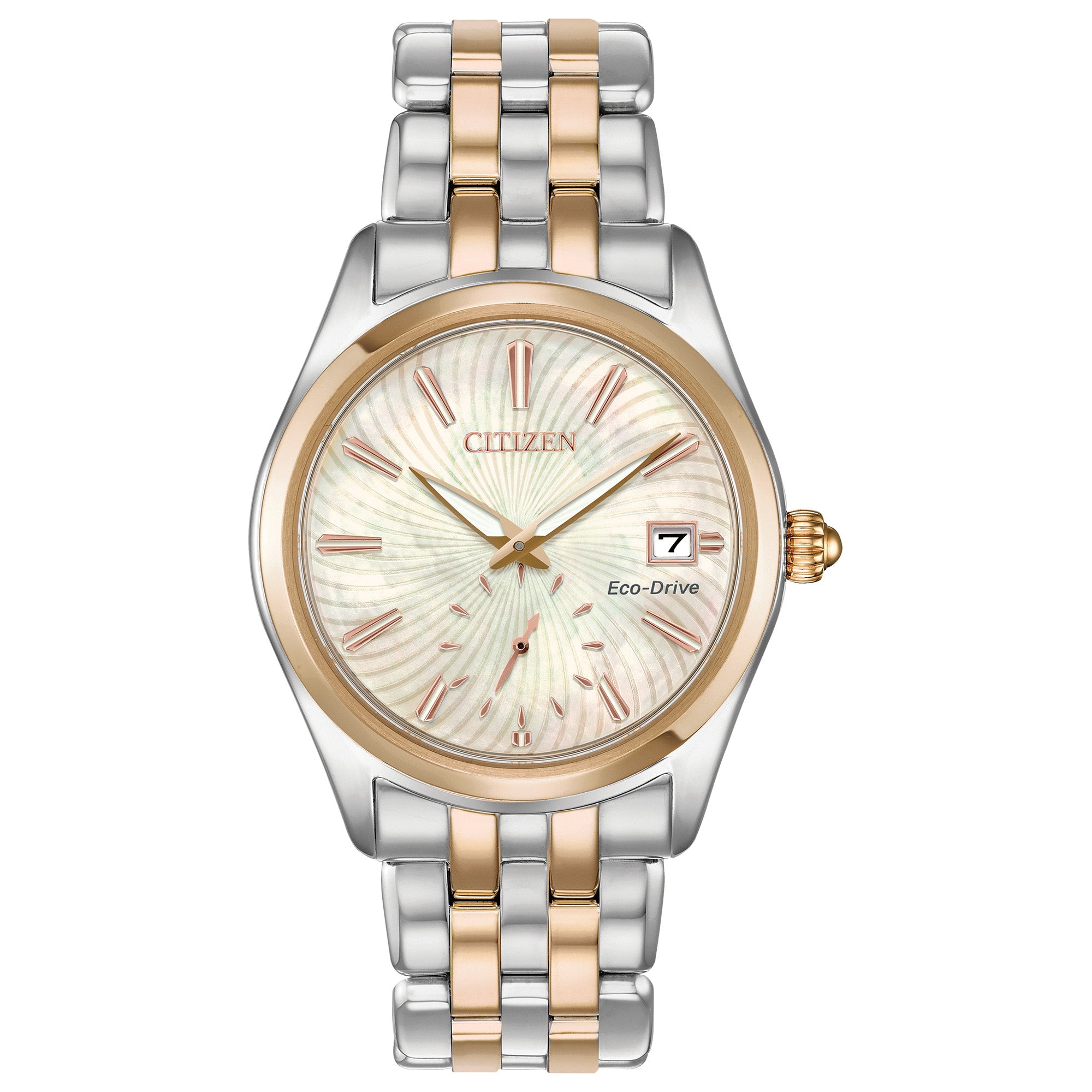 A caixa deste relógio é feita de aço inoxidável de alta qualidade. O mostrador é de madrepérola e protegido por um cristal mineral durável com resistência à água de até 100 m (330 pés). A pulseira é de aço inoxidável prateado e dourado. O movimento é solar.