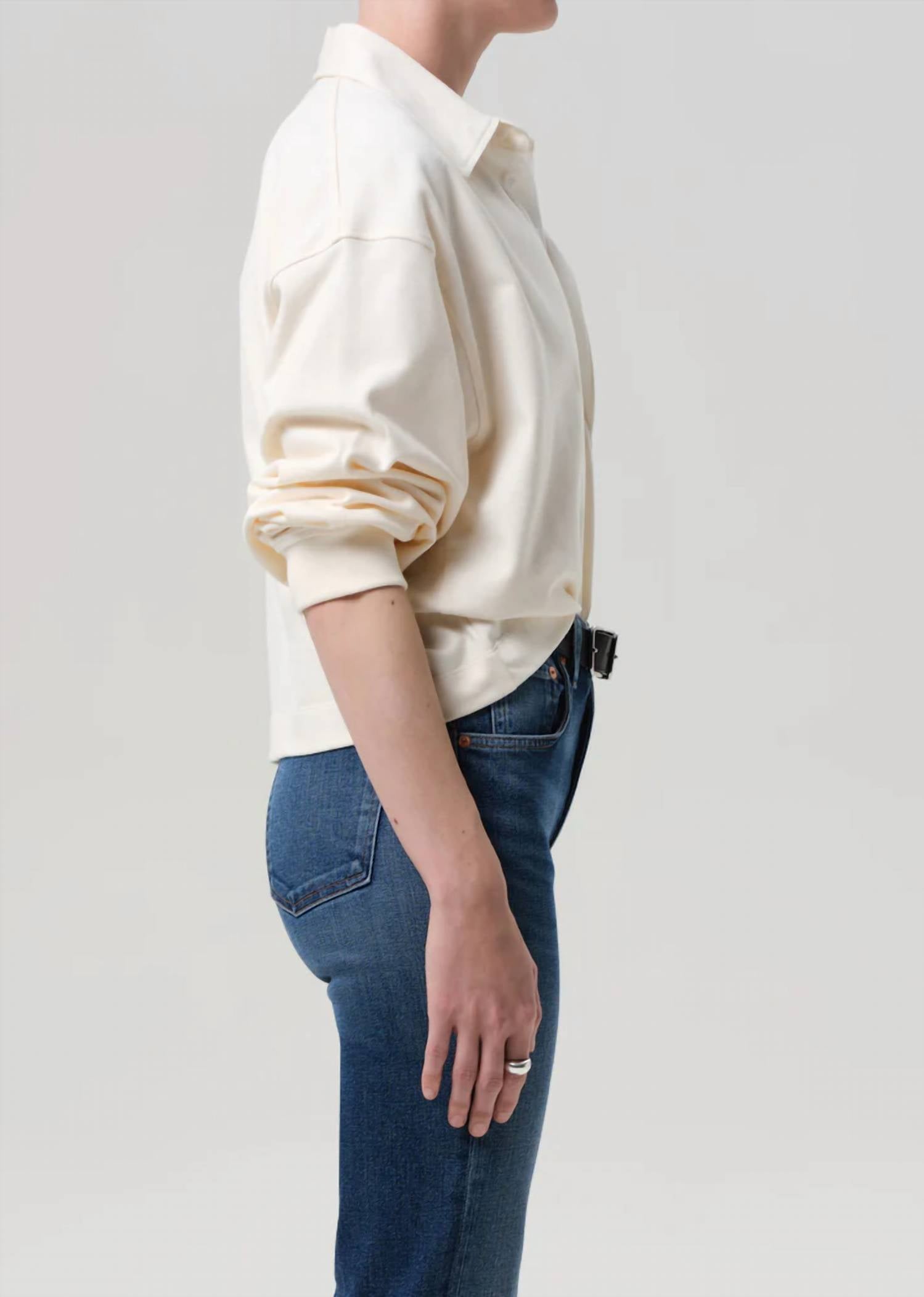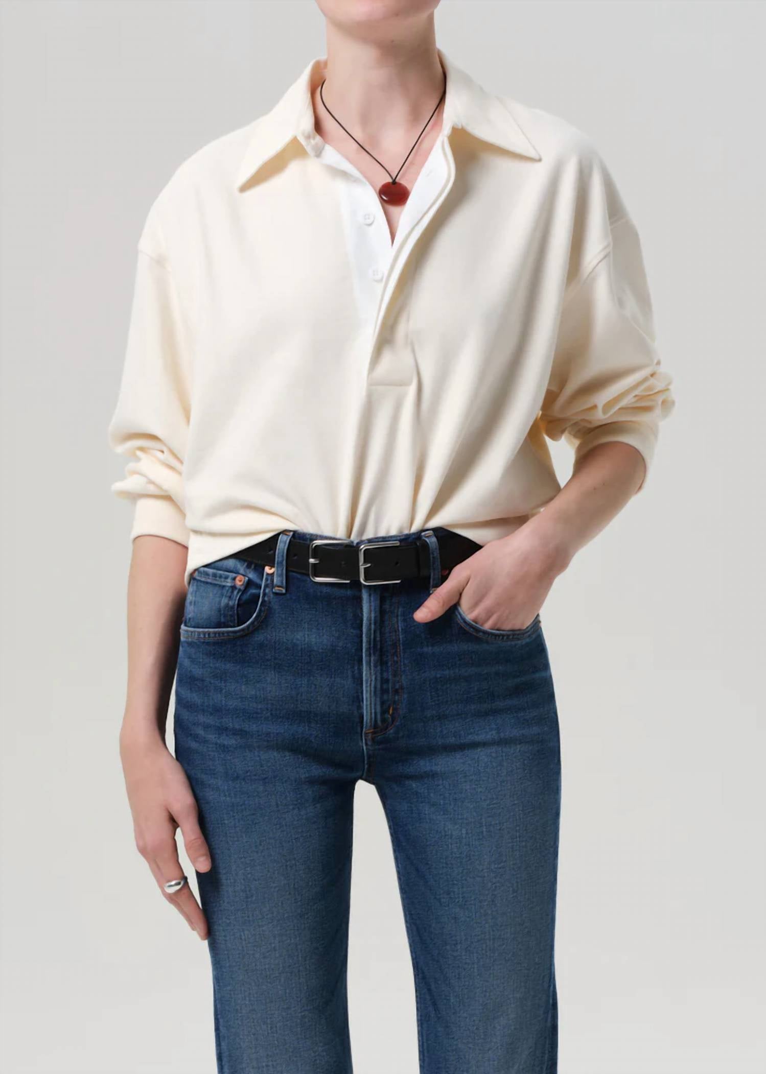 The Aris Rugby is a true-to-size off-white rugby shirt made from 100% soft-hand cotton, designed with a white collar and a clean tonal look. It has a body length of 22 1/8", a chest measurement of 47 1/2", and a sleeve length of 23 1/4". The model is 5'10" and wears a size Small. It is made in Portugal and is machine-washable in cold water.