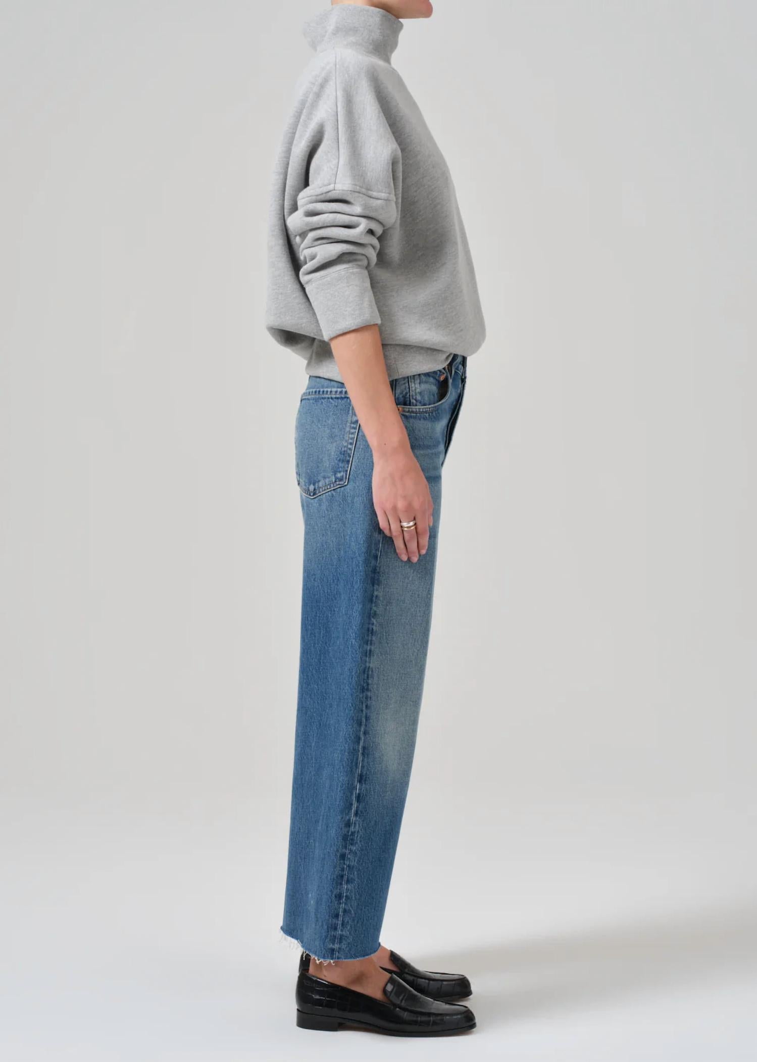 Descubra o Ayla Raw Hem Crop da Citizens of Humanity, confeccionado em luxuoso algodão 100% regenerativo na cor Doheny. Esta peça estilosa apresenta um visual texturizado em tom índigo médio com ondulações e desbotamento, proporcionando um caimento solto e pernas confortáveis para um uso confortável. Com fecho de botão, ele vem com 31 cm de altura, 68 cm de costura interna e 51 cm de abertura nas pernas. A modelo tem 1,78 m e veste tamanho 27, oferecendo um ajuste fiel ao corpo.