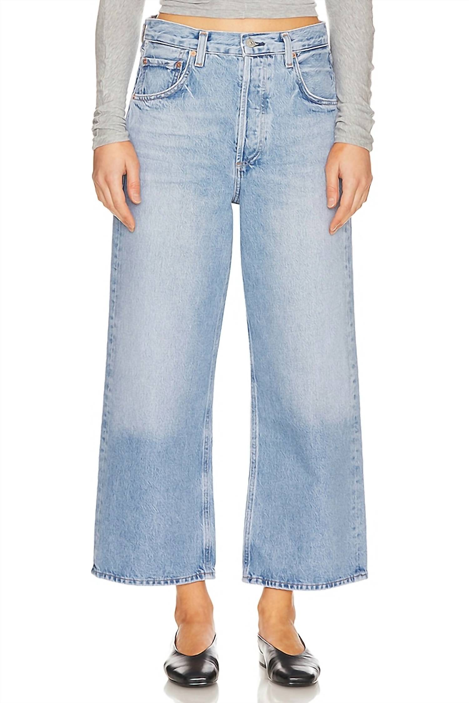 Introducing the Gaucho Vintage Wide Leg Jean by Citizens of Humanity, a minimalist piece in a misty light wash color. Featuring a high rise with a relaxed fit, these jeans boast a 12.75" rise, 26.5" inseam, and 21" leg opening, crafted from 100% organic cotton for comfort and sustainability. Closure: Button fly. Origin: Turkey. Care: Machine wash cold inside out with like colors, do not bleach, and tumble dry low.
