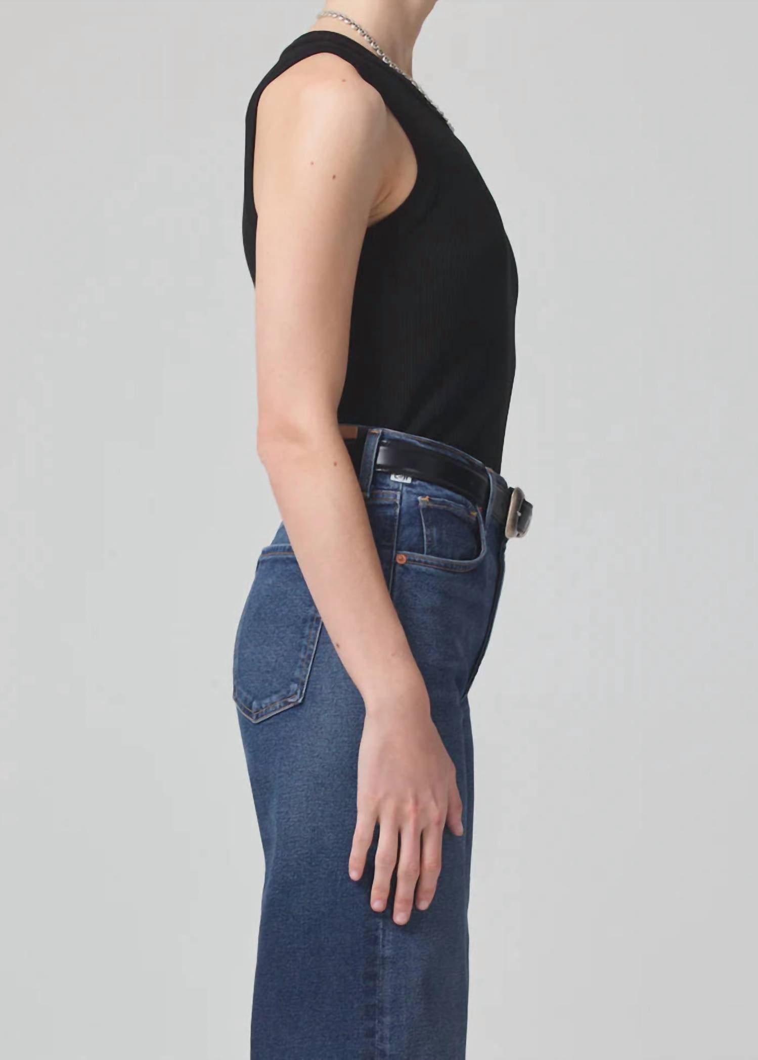 Form-fitting, ribbed racerback tank with a high neckline and cutaway armholes. This fit is true to size. Ultra-soft organic cotton rib that holds the body. Body length: 21 1/4". Shoulder to shoulder: 10 1/2". Total chest (front to back): 27". Waist: 25 1/2". Model is 5'10" and wearing a size small. 49% Tencel lyocell, 49% organic cotton, 2% spandex. Machine wash cold. Made in the USA with imported materials. Style number: 9201-3004_BLK.