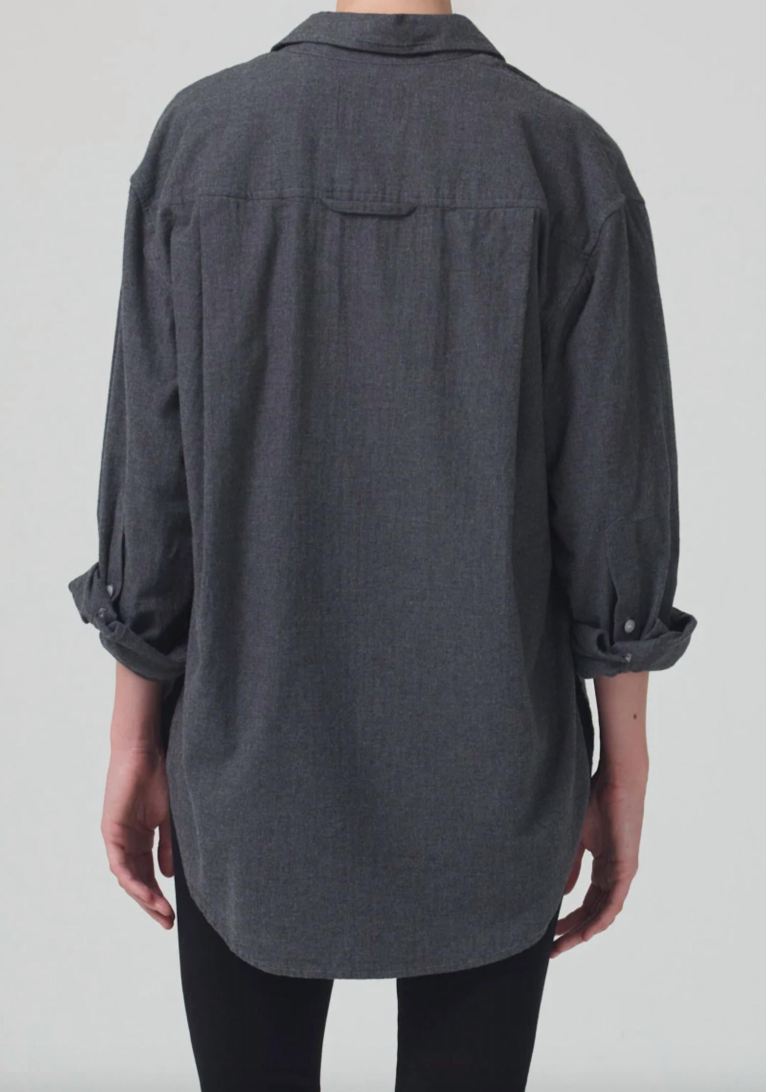 Introducing the Kayla Shirt by Citizens of Humanity, a must-have Heron Grey piece for your spring wardrobe. Designed with a classic collar and long sleeves, this oversized shirt features a versatile button closure for easy styling. Its relaxed silhouette with a high-low hem and solid pattern makes it an ideal workwear staple. Care instructions include machine wash and tumble dry for effortless maintenance.
