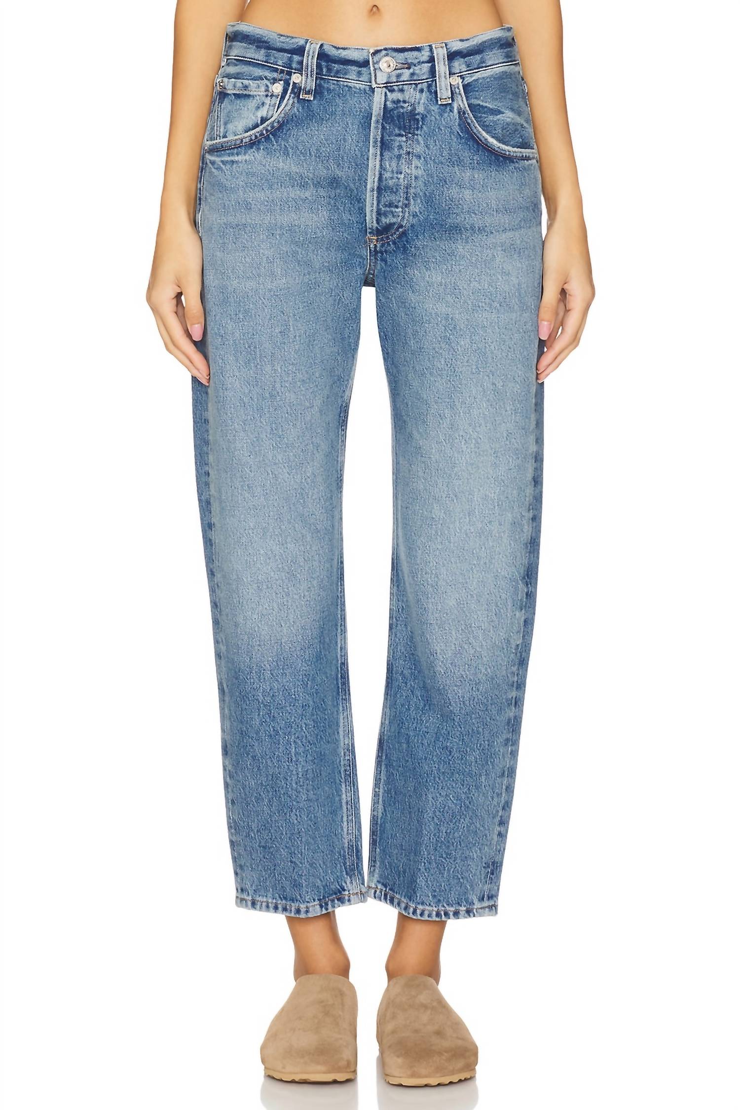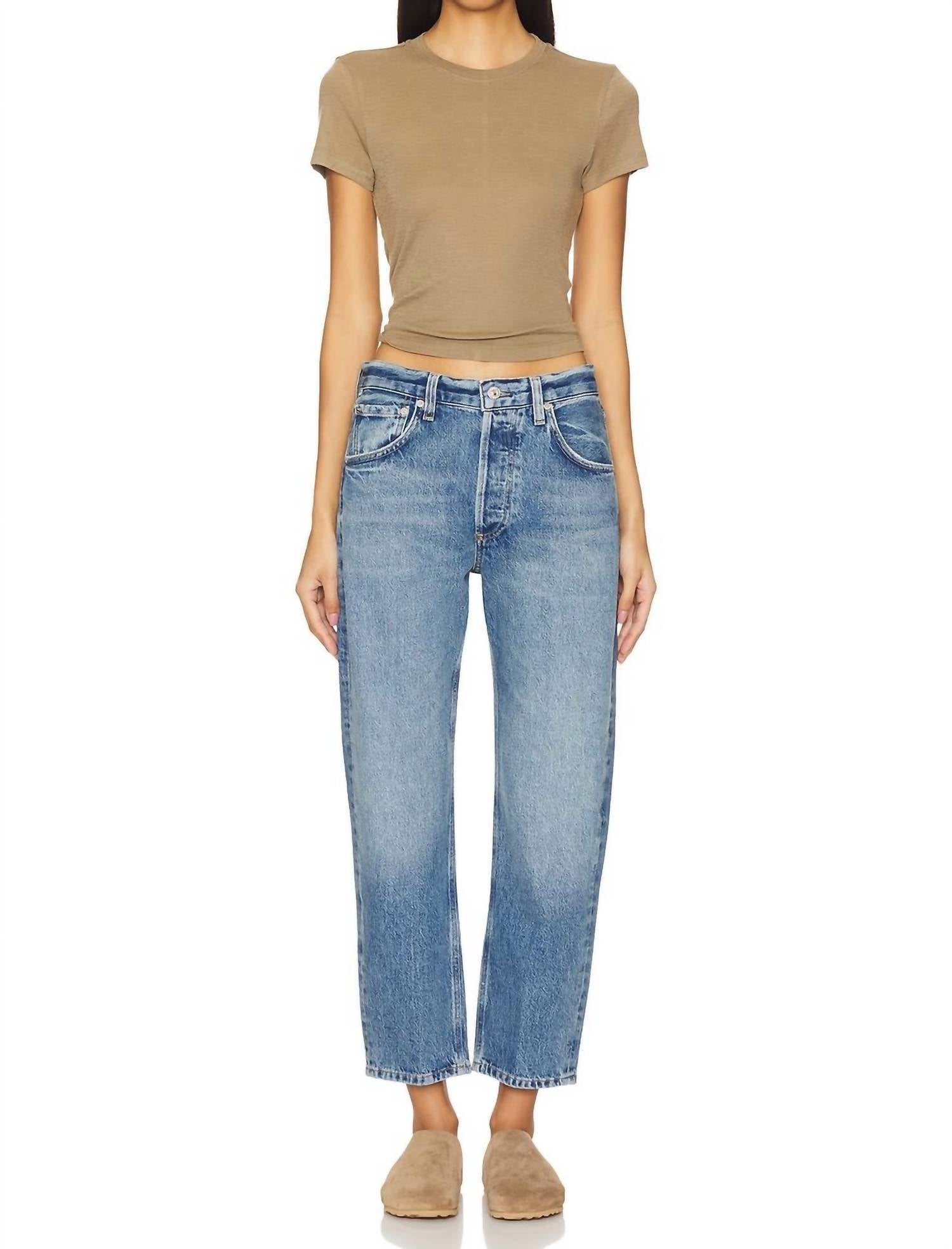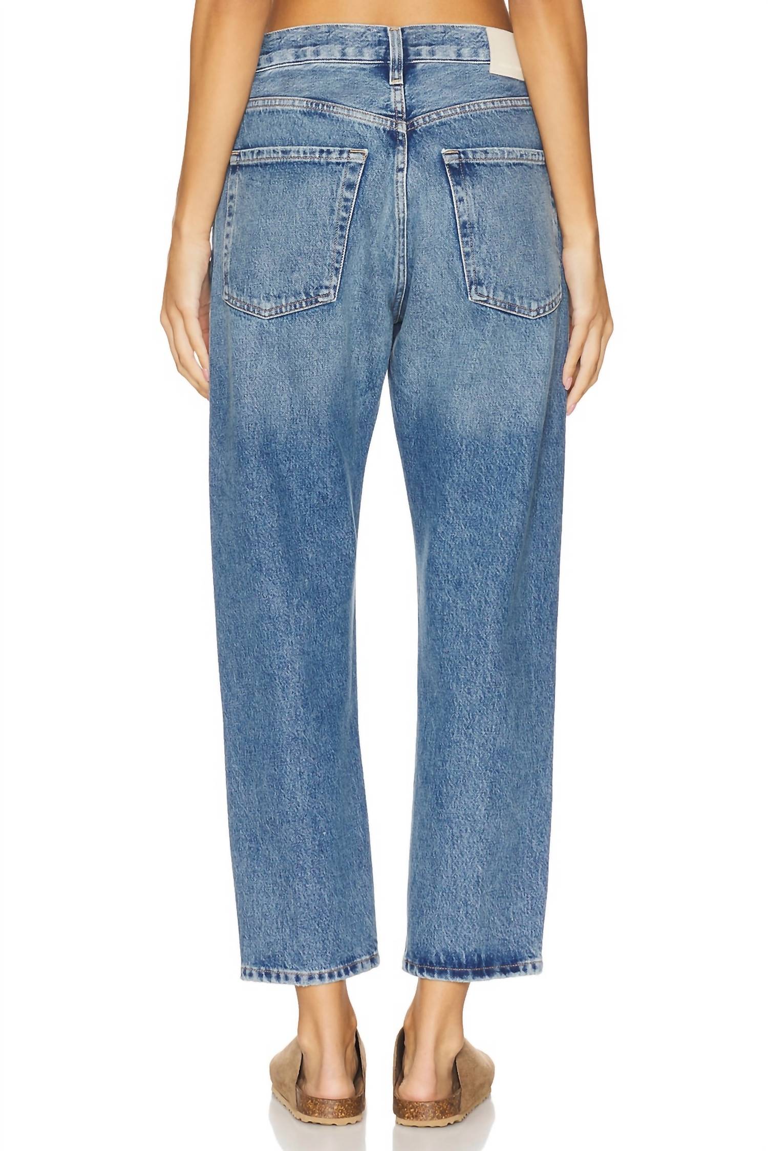 Embrace timeless style with the Winslow Cropped Boyfriend Jean by Citizens of Humanity, crafted from 100% regenerative cotton for a soft, yet rigid, feel. These medium wash denim jeans feature a vintage-inspired straight leg and a medium indigo shade with stylish whiskering and fading. They sit high on the waist with an 11 1/4" rise and a 26" inseam, making them perfect for chic evening events in the spring season. Made in Turkey, these jeans include a handy zip closure and can be machine washed and tumble dried for easy care.