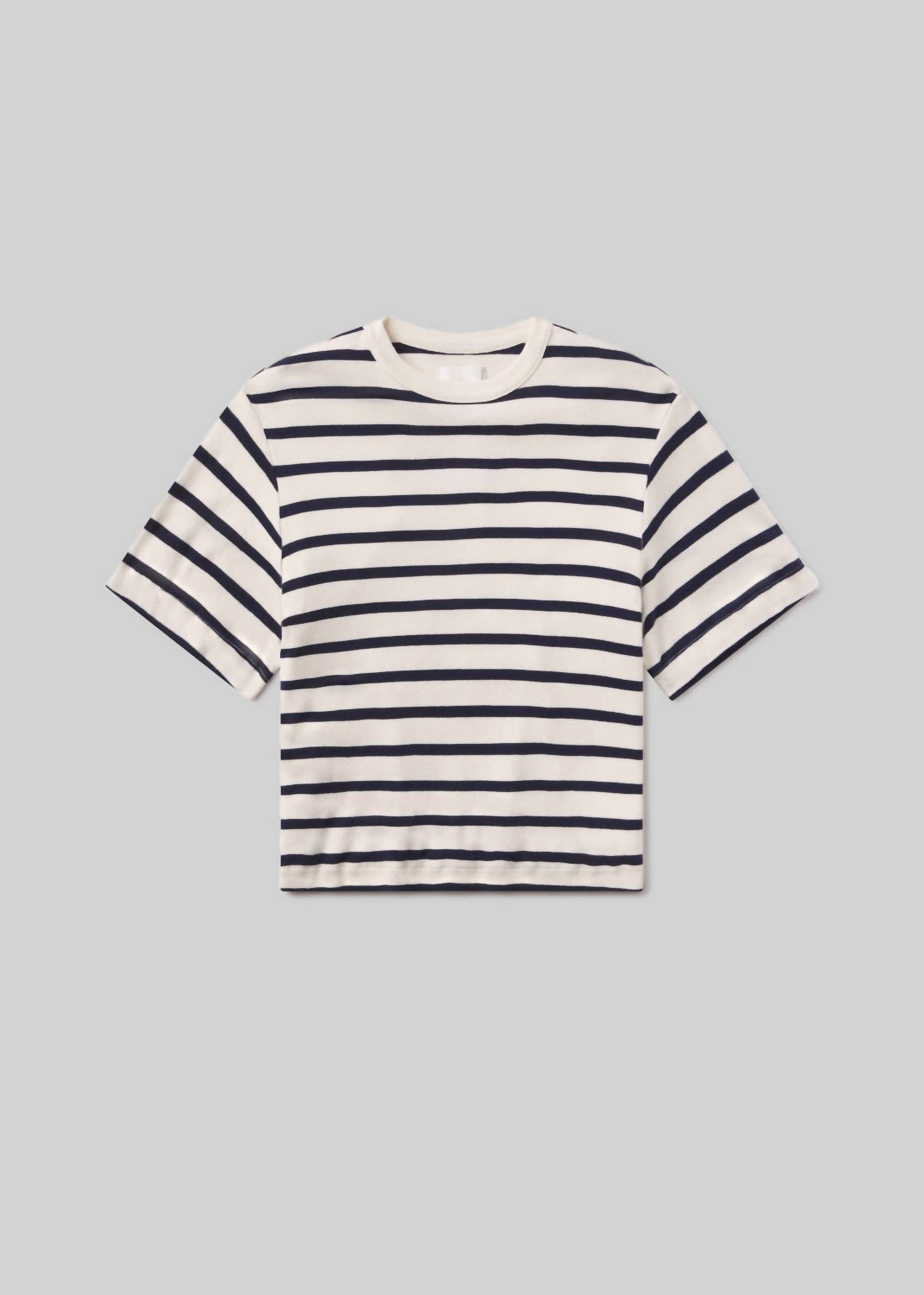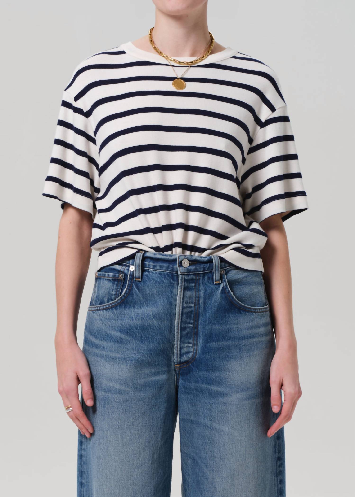 The short sleeve tee you'll want in every color. The Women's Goldie Tee by Citizens of Humanity is a casual yet stylish staple, designed for year-round appeal. Crafted with short sleeves and a comfortable crewneck, this Azure Stripe tee features a 90% cotton and 10% polyester blend, ensuring it holds its shape while providing an ultra-lightweight feel. Made in the USA with imported materials, it measures a 24" body length and 39 1/2" chest. With a convenient pull-on closure, this tee is easy to care for—machine wash it cold inside out with like colors and tumble dry low.
