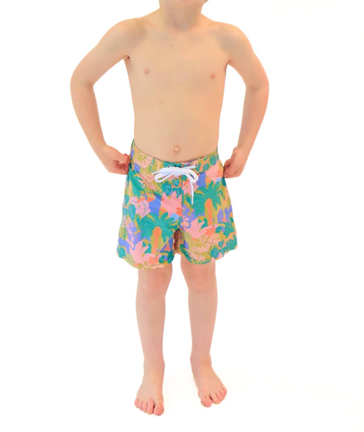 Introducing the Swim Kids Johnny Boardies by CITRINE, perfect for a fun summer beach day. These boys' boardshorts feature an elastic waist for easy fitting and a stylish back pocket detail. The patterned design in Olive Jungle adds a vibrant touch. Care instructions include hand washing and laying flat to dry to maintain their quality.