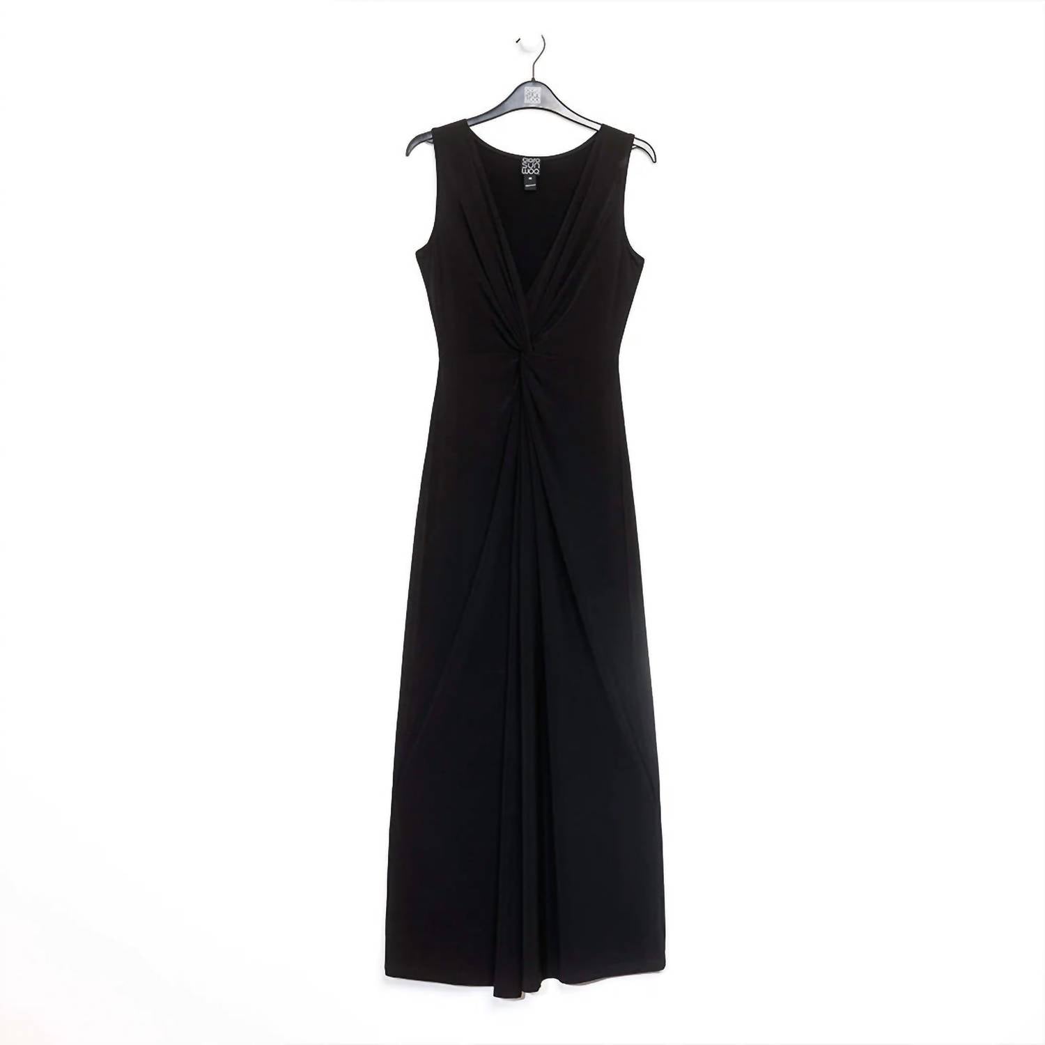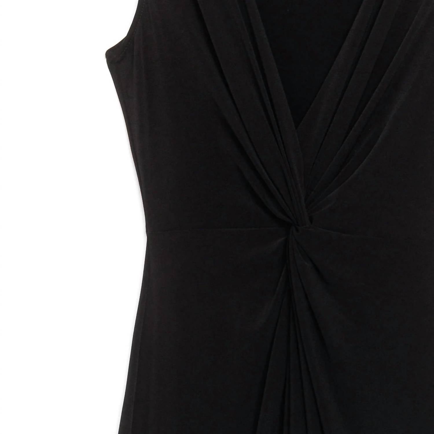 Looking for that perfect event dress? Look no further...This sleeveless dress features a deep v-neckline, wide shoulder coverage, a knotted twist bodice detail, that accentuates the waist while creating a flattering draped silhouette, with a 24" front center slit and flowing maxi hemline. Made from our signature soft stretch poly blend fibers. Easy care, quick-drying, and cooler than linen or cotton. Wrinkle free. Travel friendly. Ultra lightweight soft knit fabric. Breathable jersey like feel. 22" center front slit. Designed with a slender silhouette. Customers prefer to size up for a more relaxed fit.