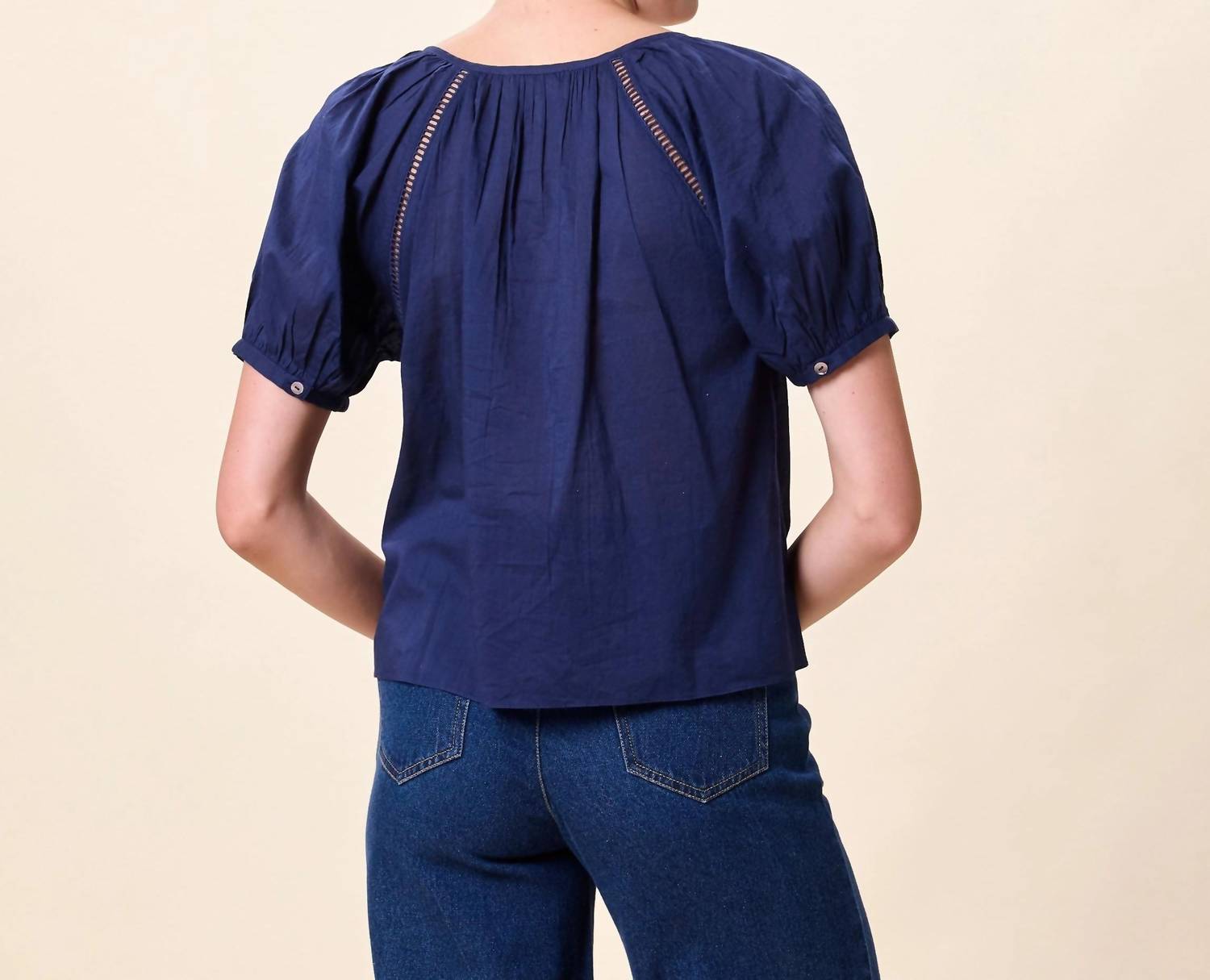 The Adeline Blouse by Cleobella is an exquisite short-sleeve top crafted from 100% GOTS certified organic cotton, ensuring a breathable and eco-friendly wear. This navy blouse showcases intricate chainstitch embroidery and delicate ladderstitch detailing, adding a touch of artisanal charm to its scoopneck design. It features a button closure for easy wearability, perfectly blending boho chic style with elegant craftsmanship. For care, simply hand wash and lay flat to dry, maintaining its timeless boho appeal for seasons to come.