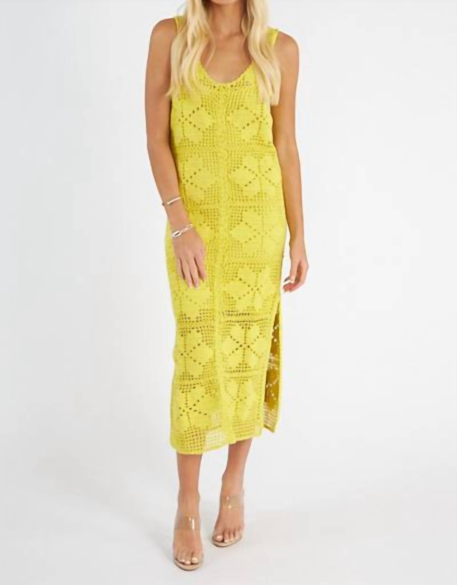 A midi dress so versatile, your options for wearing it are endless. Presenting the Joy Crochet Ankle Dress by Cleobella, a perfect embodiment of boho chic sophistication for the summer. This sleeveless dress comes in a vibrant yellow-lime hue and is crafted from textured cotton with a full rayon lining for added comfort. Designed with a sheath silhouette, it features a distinctive scoop neck and side slits, enhancing its beach day appeal. The dress offers a pull-on style for ease of wear. Care instructions suggest hand washing to maintain its intricate crochet craftsmanship. Model is 5'6" and wears an extra small.
