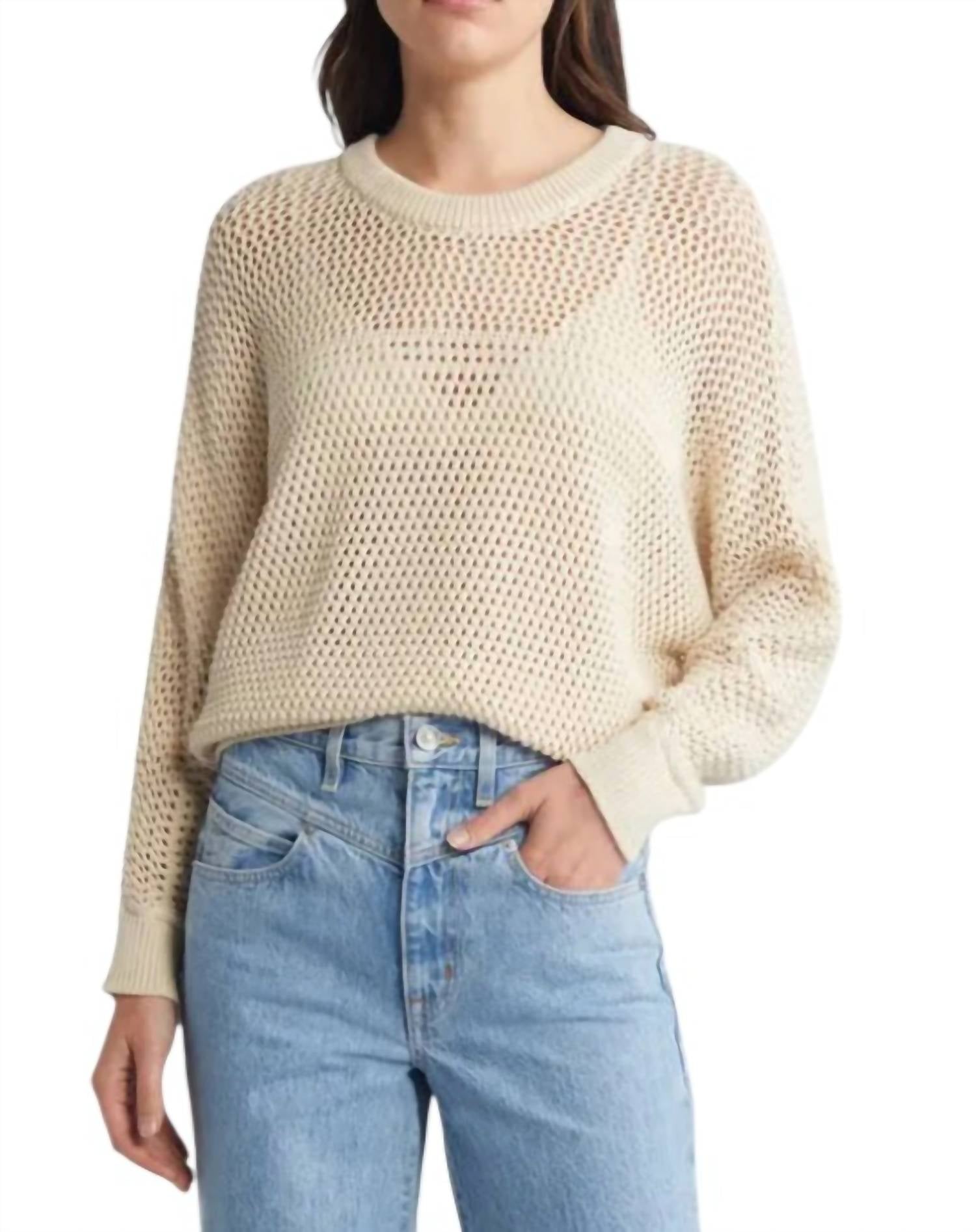 Experience the perfect blend of comfort and style with this trendy crew neck sweater, designed to effortlessly elevate your wardrobe. Pair it with your favorite denim and loafers for the perfect look. Introducing the Kiara Open Stitch Organic Cotton Sweater by Cleobella, a minimalist masterpiece in timeless ivory. This sweater features long sleeves and a classic crewneck design, exuding effortless style with its textured open knit. Crafted from 100% organic cotton, this pullover is a chic essential for any autumn occasion. Care: Dry clean only. Length: 20.5 inches. Made for women, this piece is perfect for a cozy evening or a stylish stroll.