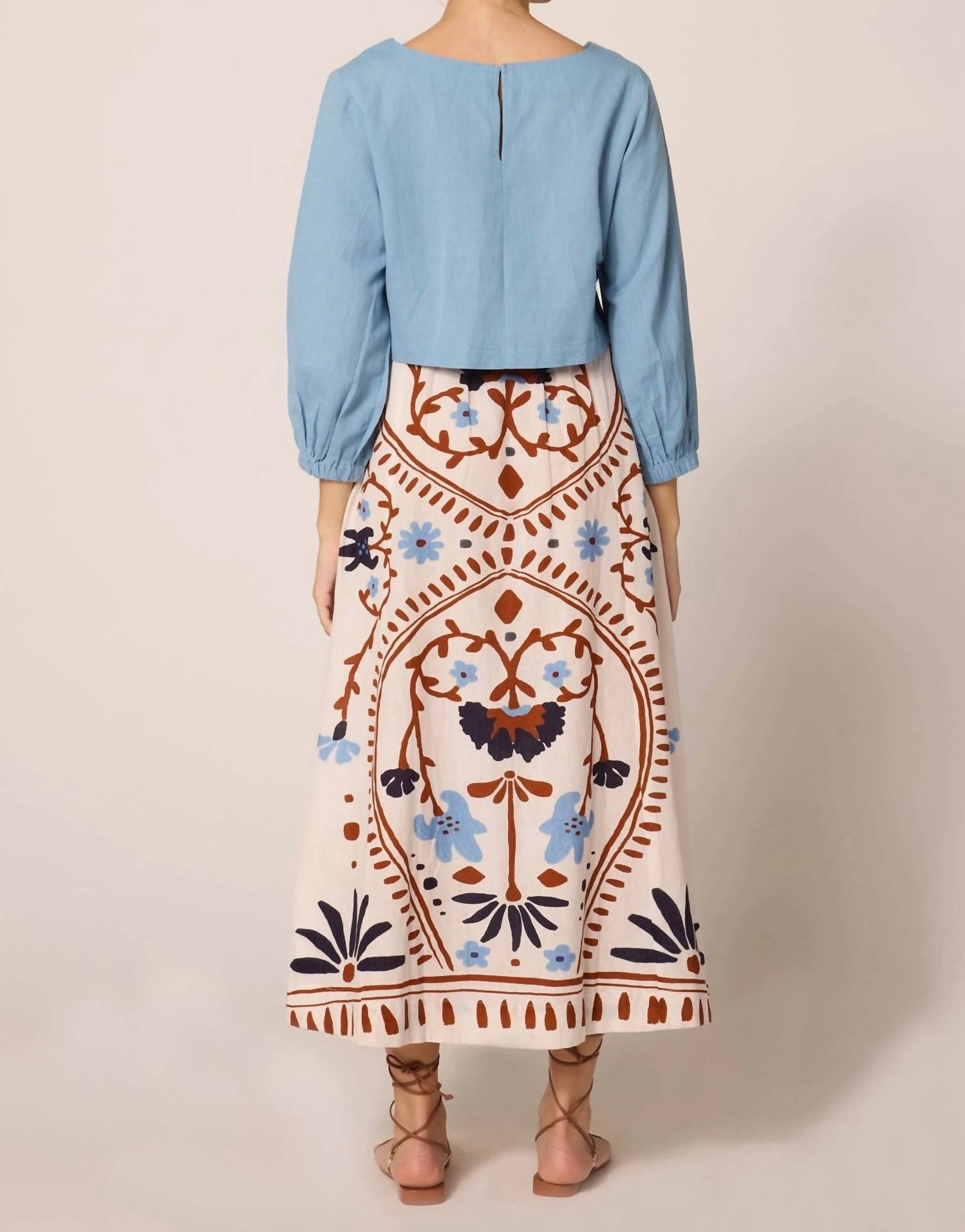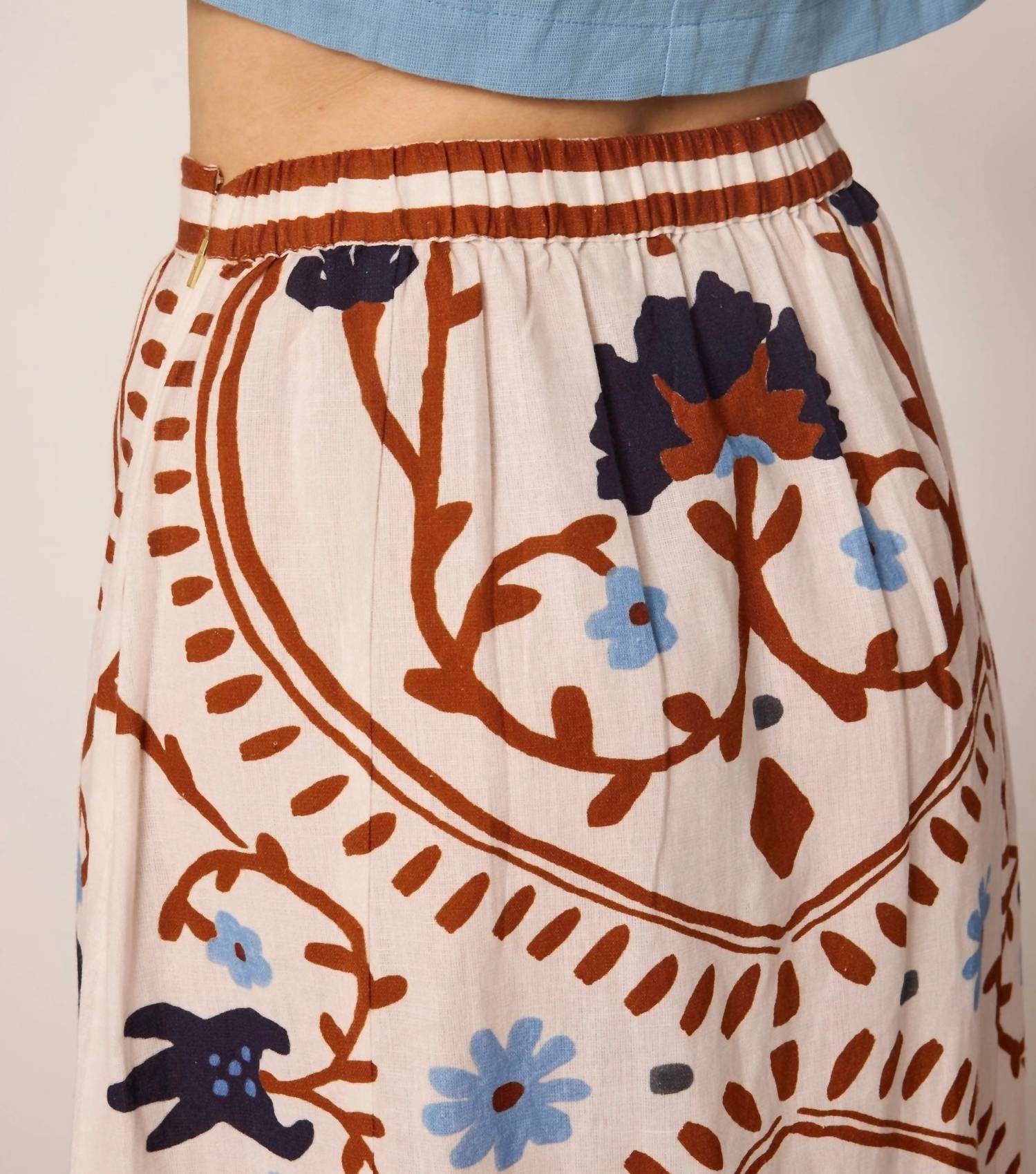 Boho chic piece perfect for a holiday party. Crafted from a blend of 70% cotton and 30% linen. Ethically handmade in India. Featuring an adjustable fit with an elastic back waist and a side seam zipper for easy closure, it is accentuated by border details at the top and bottom hem. Care instructions include hand washing and laying flat to dry.