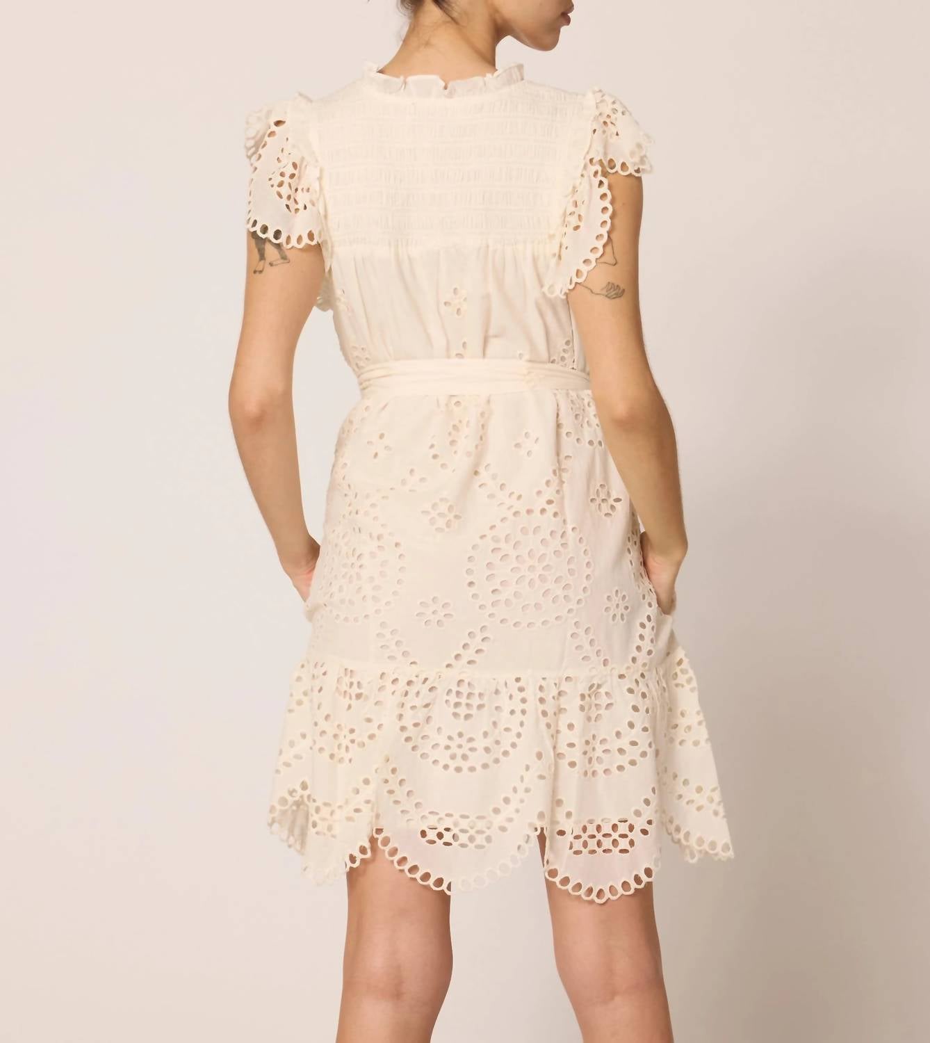 A short and breezy dress for those warmer days. Experience the elegance of the Mireya Mini Dress by Cleobella, designed for a touch of boho chic in ivory eyelet. This dress features long sleeves with scalloped eyelet details, made from 100% GOTS certified organic cotton, and ethically handmade in India. Length: 34.75 inches. Closure: Cleobella invisible zipper at side seam. Care: Hand wash cold, lay flat to dry. Perfect for those vacation days, this bra-friendly piece includes a square neckline with smocking and a removable waist sash, complete with pockets for added functionality.