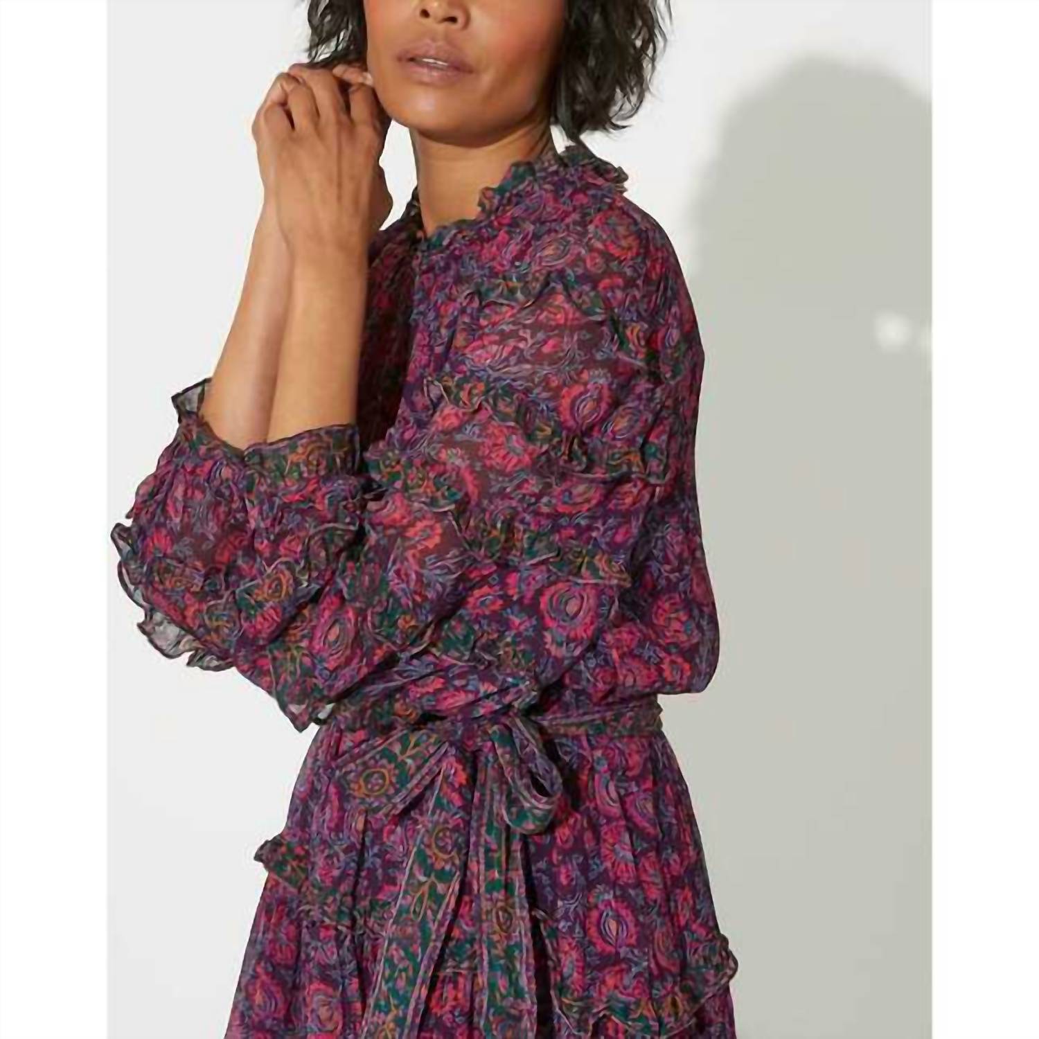 The perfect mini dress for those warmer months. Introducing the Rosalia Mini Dress by Cleobella, a boho chic essential in Bordeaux Floral. This dress boasts long sleeves and features luxurious viscose with a textured pattern, perfect for spring vacations. Crafted in India, it includes a button closure and is complemented by a detachable waist tie for a personalized fit. Care for this cherished piece with hand washing to maintain its beauty and quality.