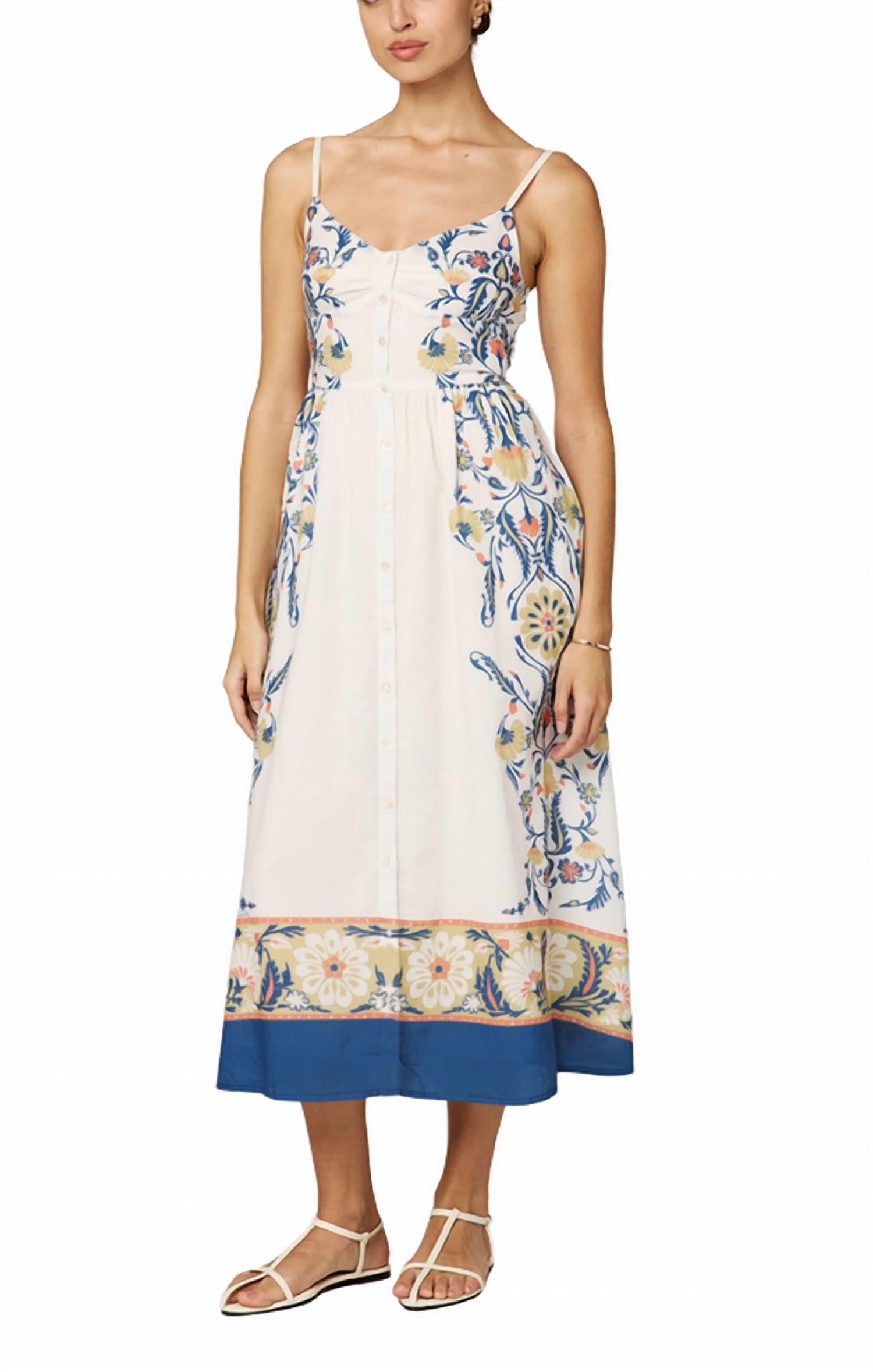 Apresentamos o Vestido Midi Tamasin da Cleobella na marcante cor Mônaco, perfeito para capturar a elegância sem esforço. Este vestido é feito 100% de algodão orgânico GOTS e eticamente feito à mão na Índia, com corte justo e comprimento de 124 cm. Possui decote coração, alças ajustáveis, detalhe de botões frontais e franzido lateral para um caimento elegante, além de bolsos práticos. Fechamento: Zíper nas costas. Cuidados: Lavar à mão com água fria, secar na horizontal ou lavar a seco.