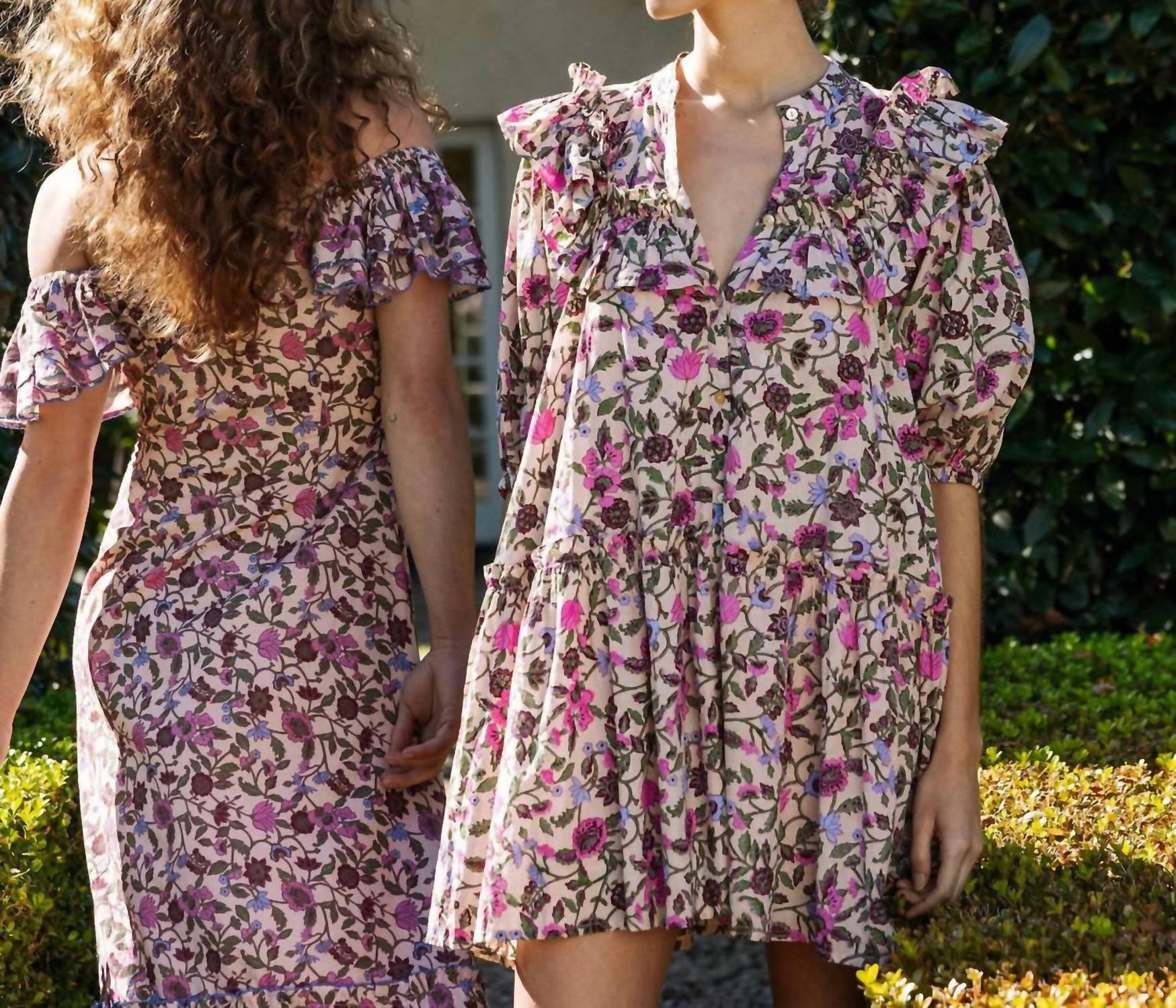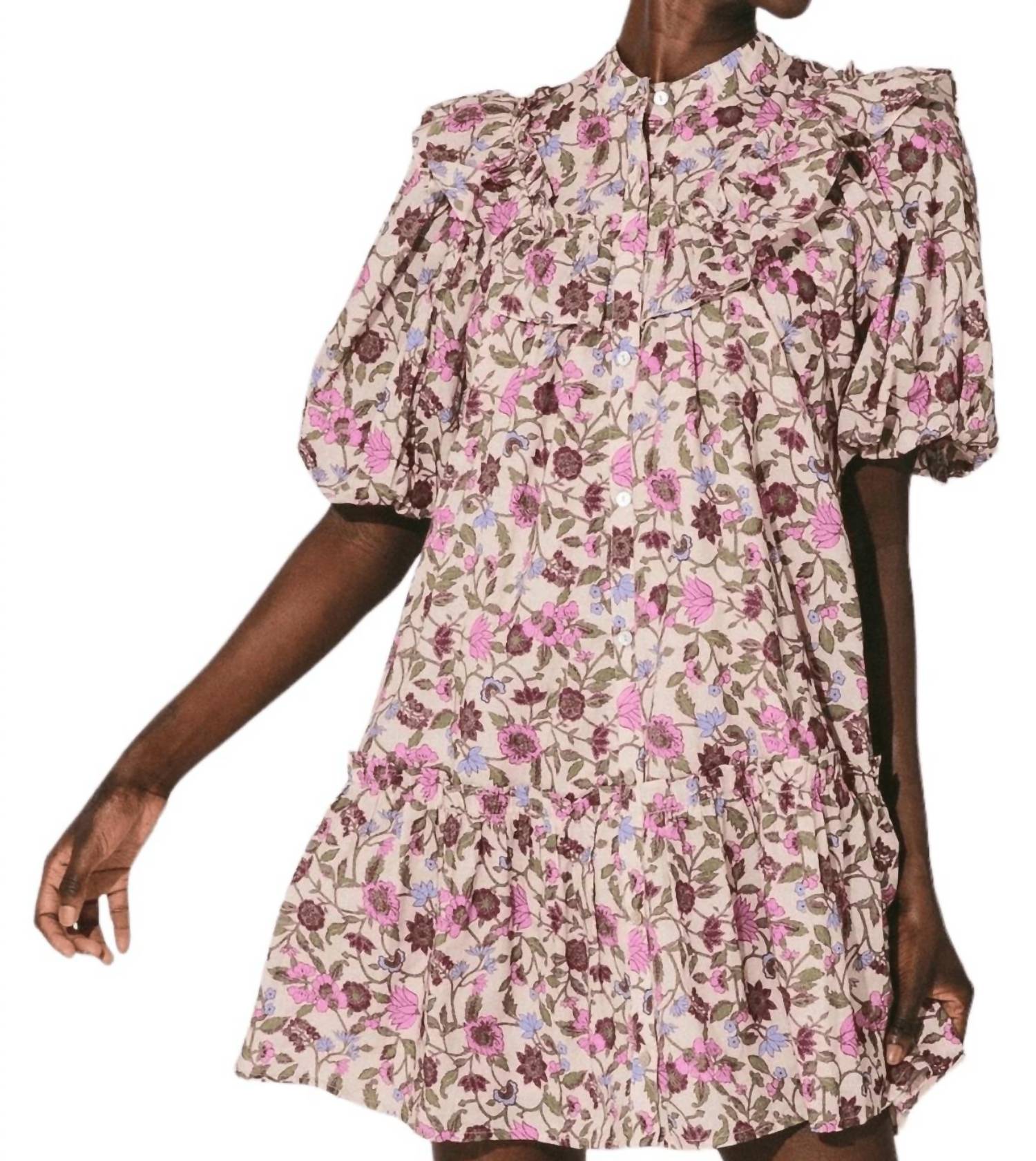 The kind of easy and flattering dress you'll be reaching for all season long. Made of GOTS certified organic cotton voile. Ethically handmade in India. Bra friendly. Relaxed fit. Highneck. Button down mini dress with ruffle detail. Puff sleeves with elasticized sleeve opening. Comes with removable sash for adjustability. Pockets. Lined. Hand wash cold, lay flat to dry. If taller than 5'9" size up.