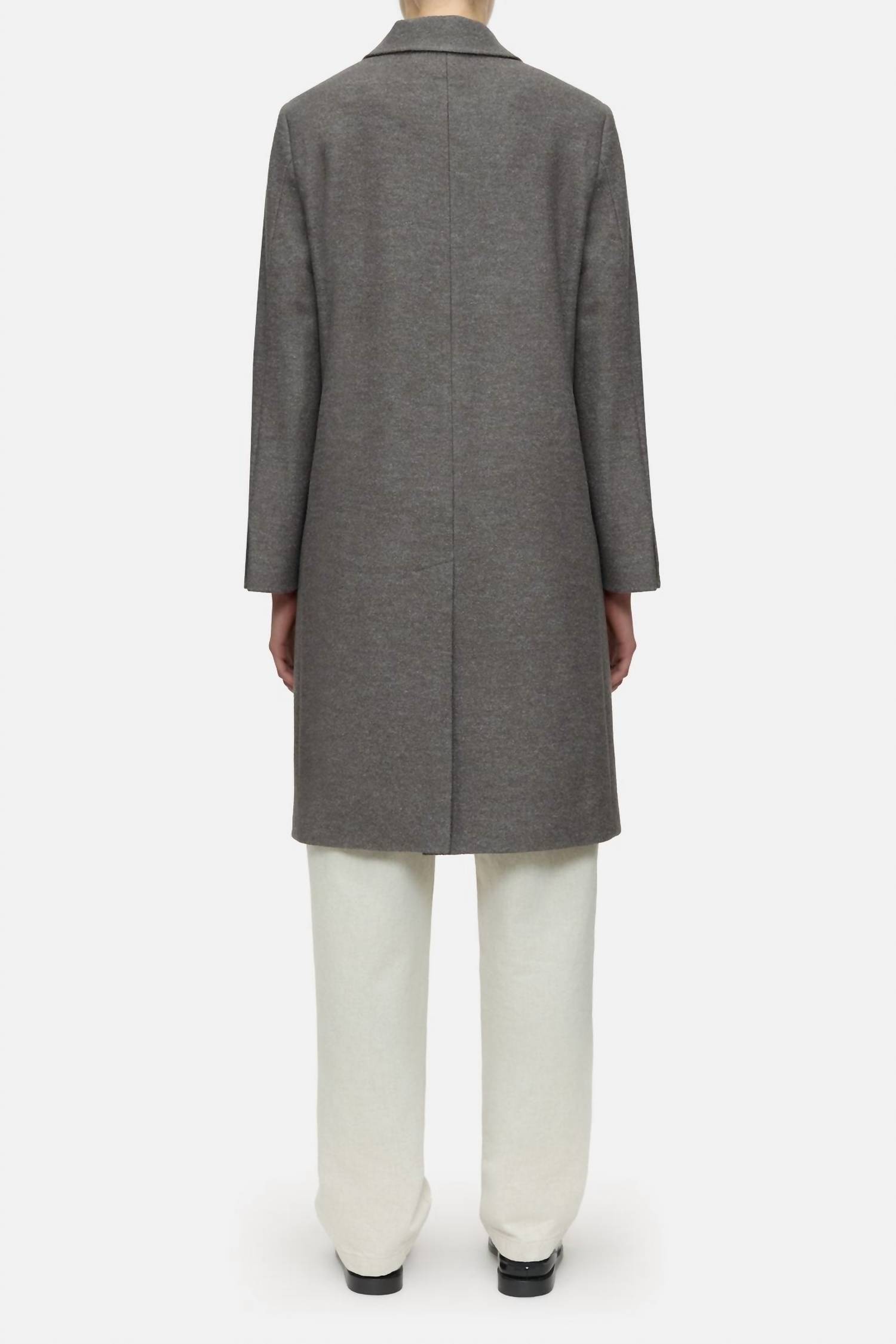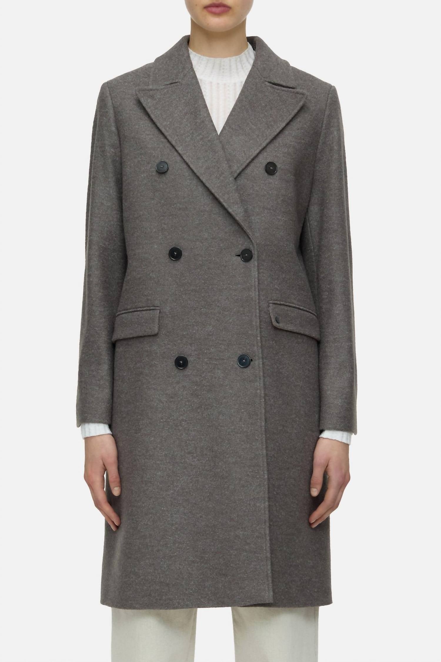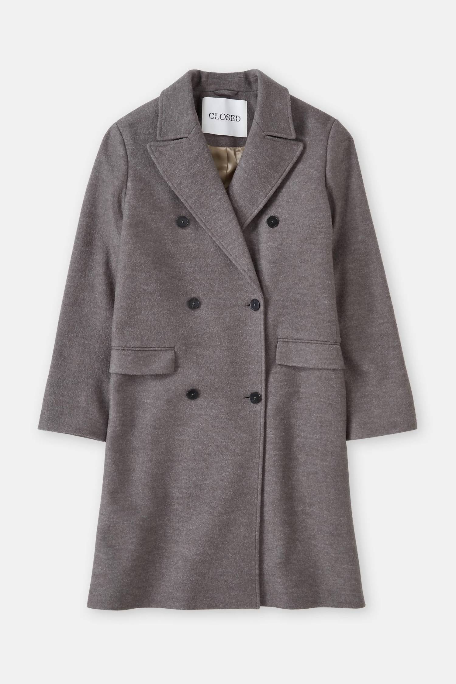 The Wool Double-breasted Coat by CLOSED is a sophisticated addition to your fall wardrobe, crafted from luxurious wool blend bouclé fabric in Heritage Grey. It features long sleeves, a solid pattern, and a classic double-breasted design with a lapel collar. The coat is equipped with horn-look button closure, flap pockets, and a smooth lining with a buttoned inside pocket for added practicality. Manufactured in Romania, this elegant piece requires delicate care with dry cleaning only.