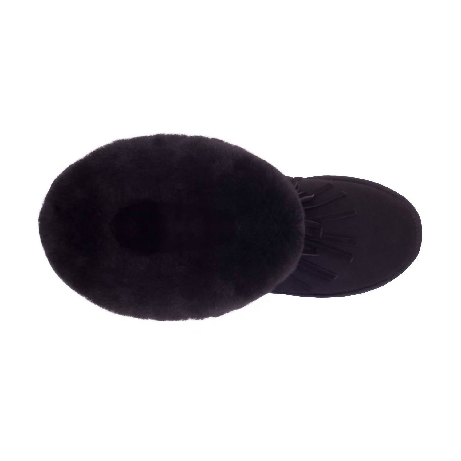 Você vai desejar dias chuvosos com essas botas de chuva estilosas e funcionais. Apresentamos a Bota Feminina Clássica de Pele de Carneiro com Franjas da CLOUD NINE, uma escolha sofisticada para o inverno. Esta bota de cano alto, disponível na cor preta, ostenta um interior luxuoso com forro 100% em pele de carneiro genuína e um cabedal resistente em pele de carneiro dupla face para conforto e durabilidade. O solado de EVA/TPR da bota garante durabilidade e aderência em condições climáticas adversas. Experimente calor e estilo incomparáveis com esta peça essencial de inverno.