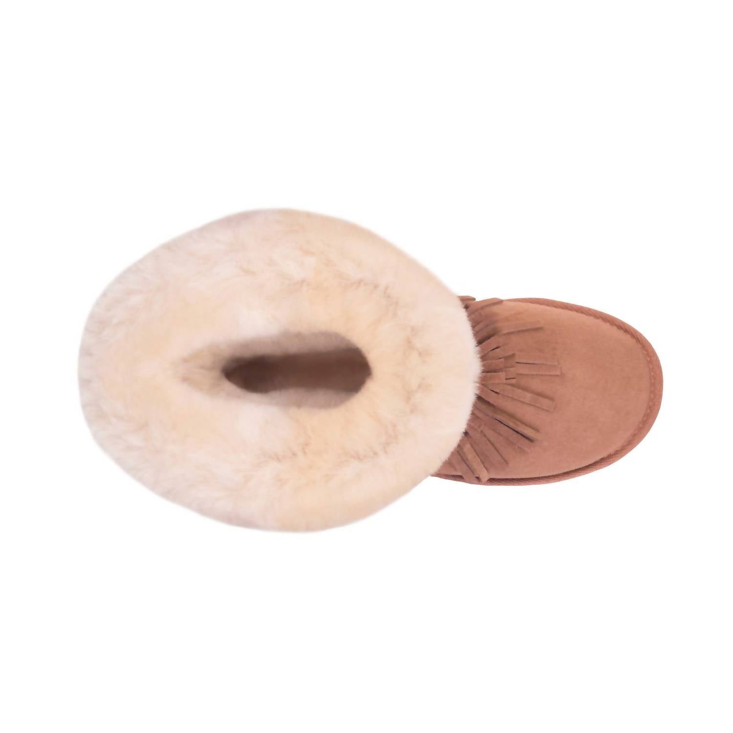 Abrace o inverno com a Bota Feminina Clássica de Pele de Carneiro com Franjas da CLOUD NINE em um tom castanho quente. Estas botas de cano alto apresentam forro 100% em pele de carneiro genuína e cabedal em pele de carneiro dupla face, prometendo conforto e estilo. O solado durável é feito de EVA/TPR, garantindo estabilidade e longevidade. Experimente o máximo conforto e estilo atemporal com estes itens essenciais de inverno.