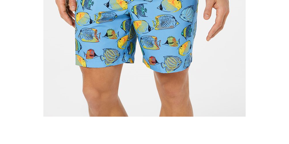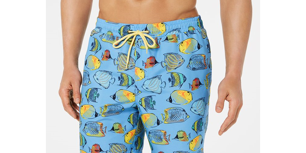 Mergulhe no refrescante estilo e conforto subaquático com as estampas coloridas de peixes e o interior forrado em tela deste calção de banho de secagem rápida da Club Room. | Costura interna aprox.; 7 | Cós com cordão | Forro interno em tela | Tecido de secagem rápida; estampa de peixes; dois bolsos laterais; bolso com aba na parte traseira direita | | Poliéster